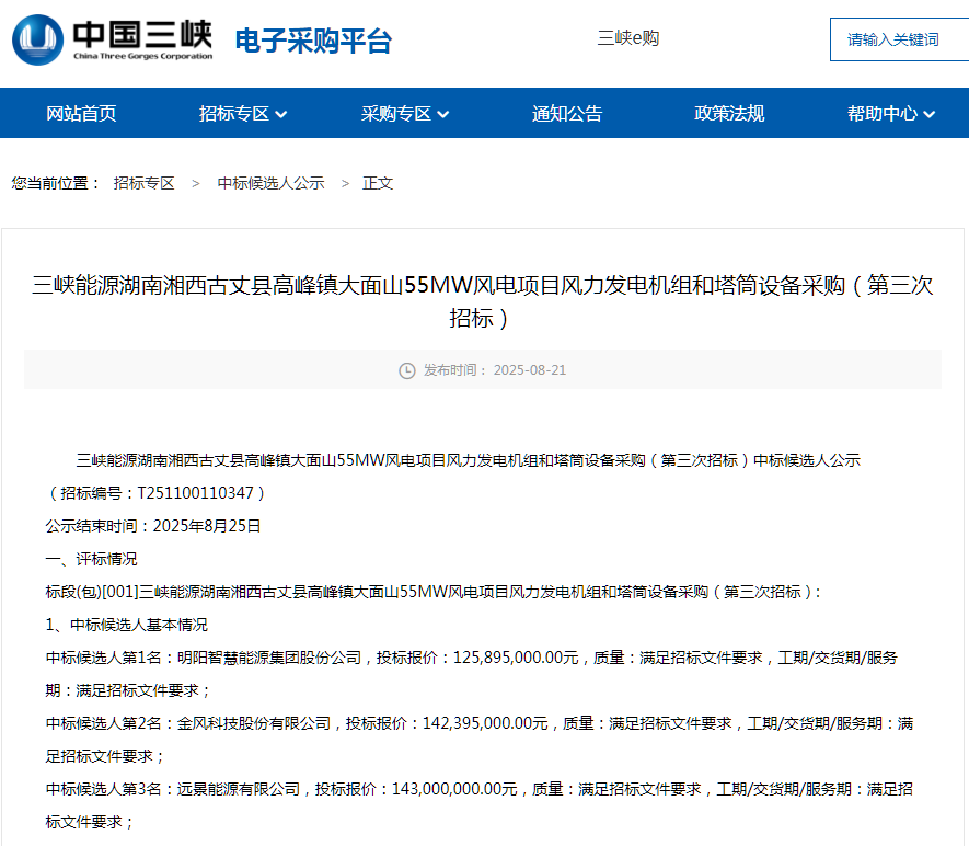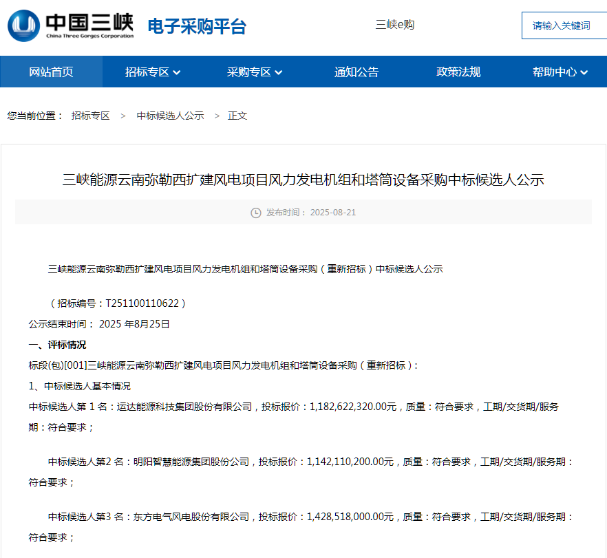 电力家获悉,8月21日,三峡能源云南弥勒西扩建风电项目、三峡能源湖南湘西古丈县高峰镇大面山55MW风电项目、三峡能源宁夏中泰红寺堡15万千瓦风电项目风力发电机组采购中标候选人公示,项目规模合计750MW,单机容量5-6.25MW。