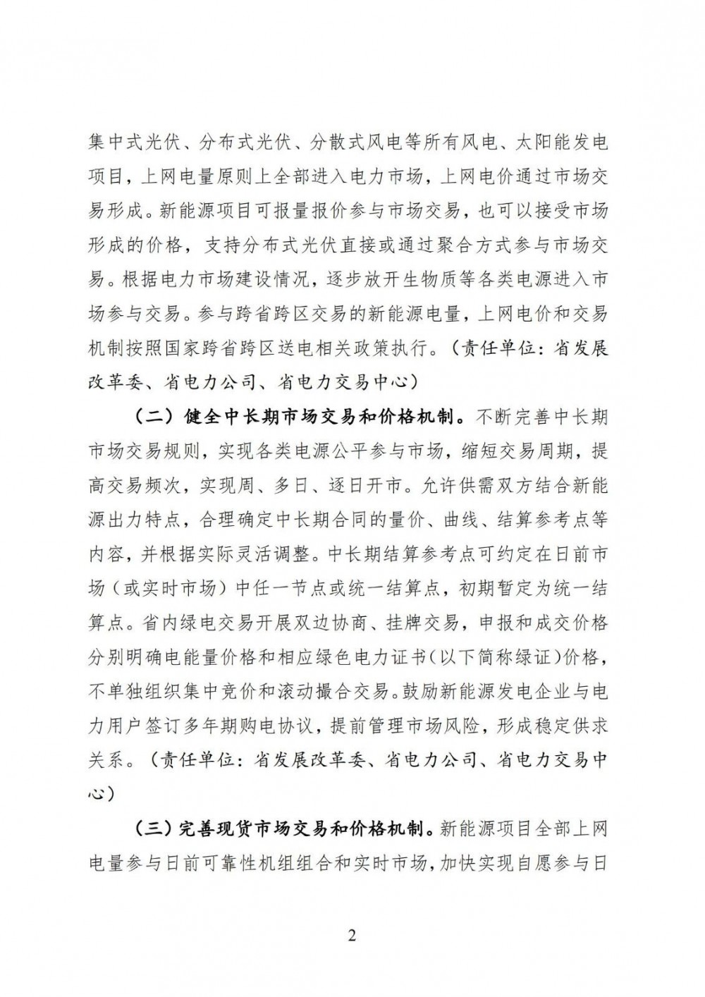 其中提到,推动新能源上网电量参与市场交易。集中式风电、集中式光伏、分布式光伏、分散式风电等所有风电、太阳能发电项目,上网电量原则上全部进入电力市场,上网电价通过市场交易形成。新能源项目可报量报价参与市场交易,也可以接受市场形成的价格,支持分布式光伏直接或通过聚合方式参与市场交易。根据电力市场建设情况,逐步放开生物质等各类电源进入市场参与交易。参与跨省跨区交易的新能源电量,上网电价和交易机制按照国家跨省跨区送电相关政策执行。