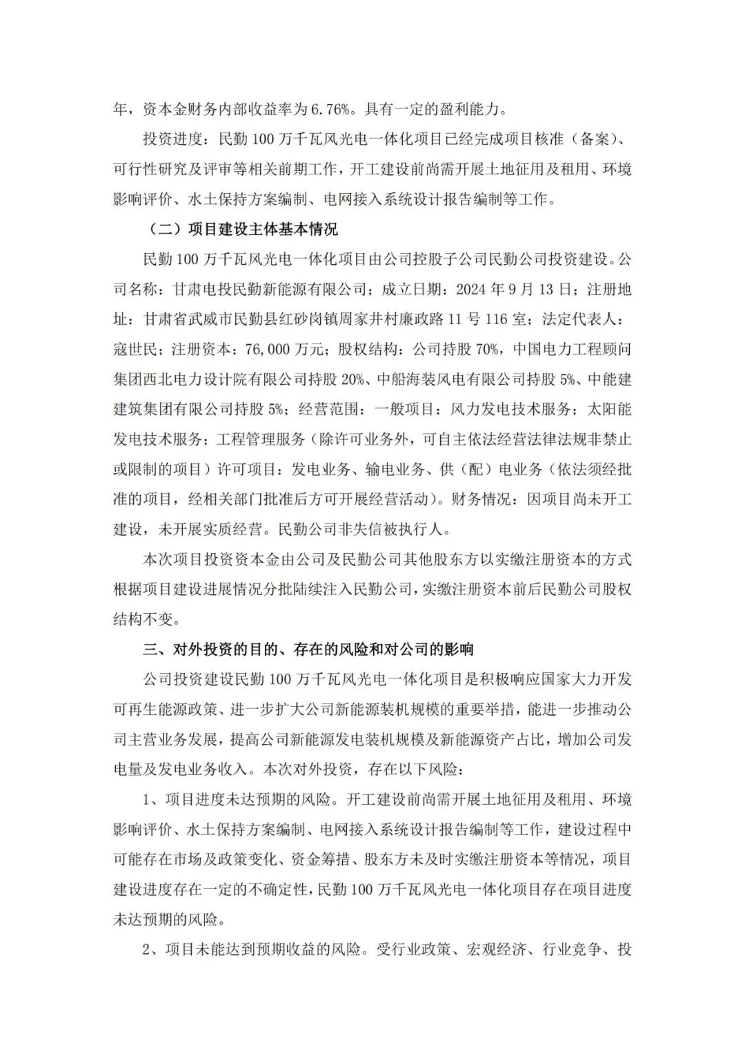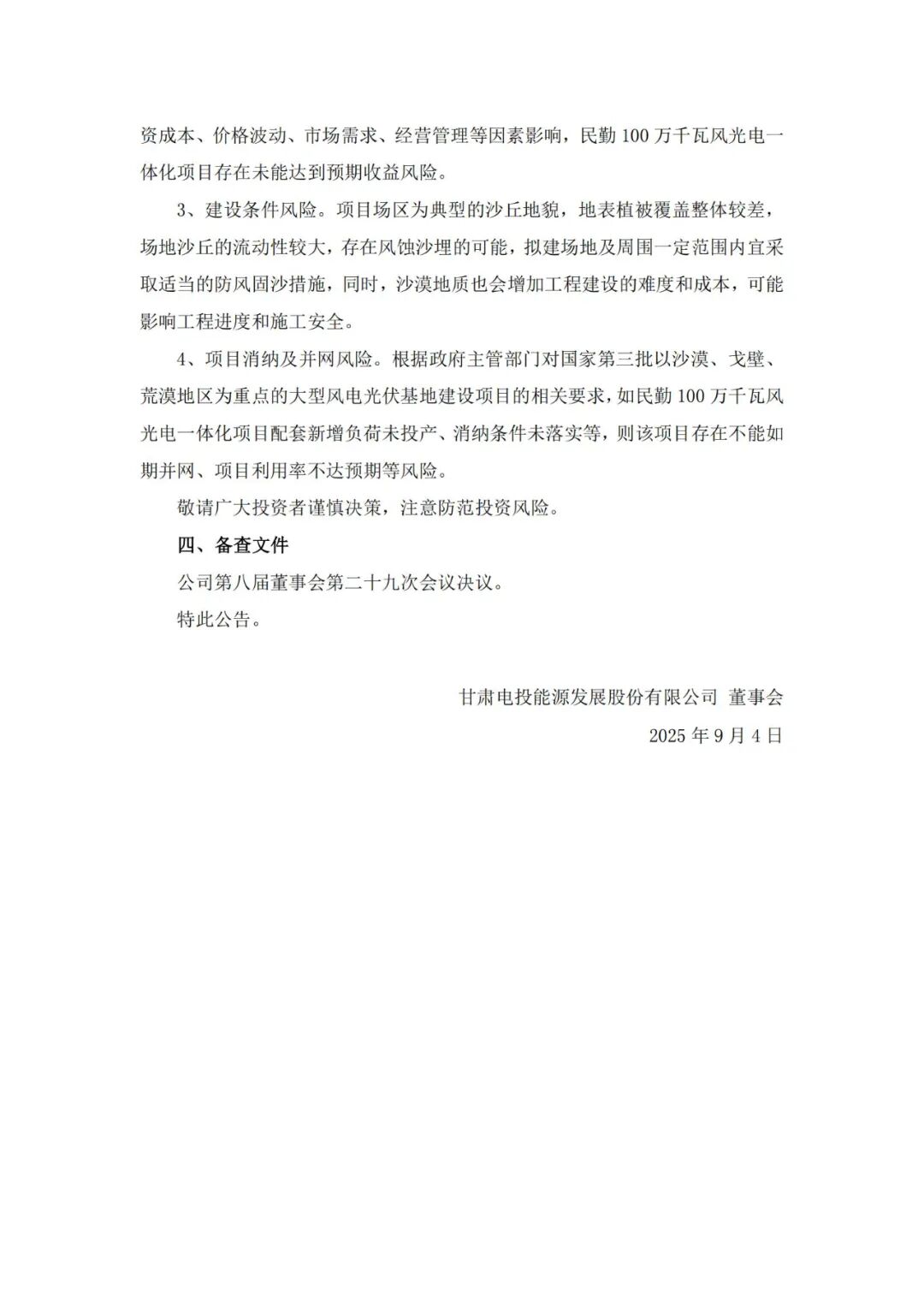 2025年9月3日,公司第八届董事会第二十九次会议审议通过了《关于投资建设民勤100万千瓦风光电一体化项目的议案》。