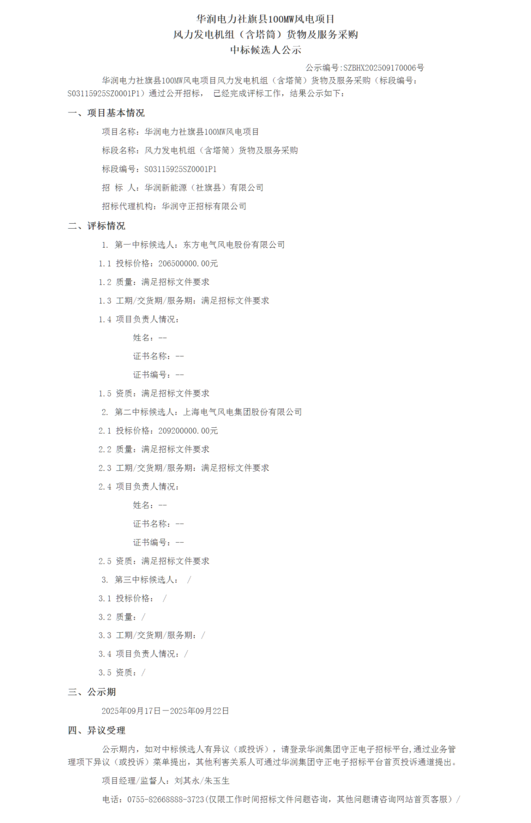 华润新能源清远佛冈山泉风电项目位于广东省清远市佛冈县,总容量50MW(超过按照50MW计算),不超过8台风电机组,单机容量不大于6.7MW,投标机型方案的整场平均单位千瓦扫掠面积不低于5.75m2/kW,塔架型式为全钢式刚性塔架,风机静止状态下叶尖最小离地距离(计算方法:轮毂中心高度-认证叶轮直径/2)不低于14m,叶尖离风机平台边坡距离不低于10m。交货期/工期:锚栓交货时间:2025年9月30日全部锚栓。风机(含塔筒)交货时间:2025年11月15日第一批4套风机(含塔筒)设备;2025年12月15日剩余风机(含塔筒)设备 。