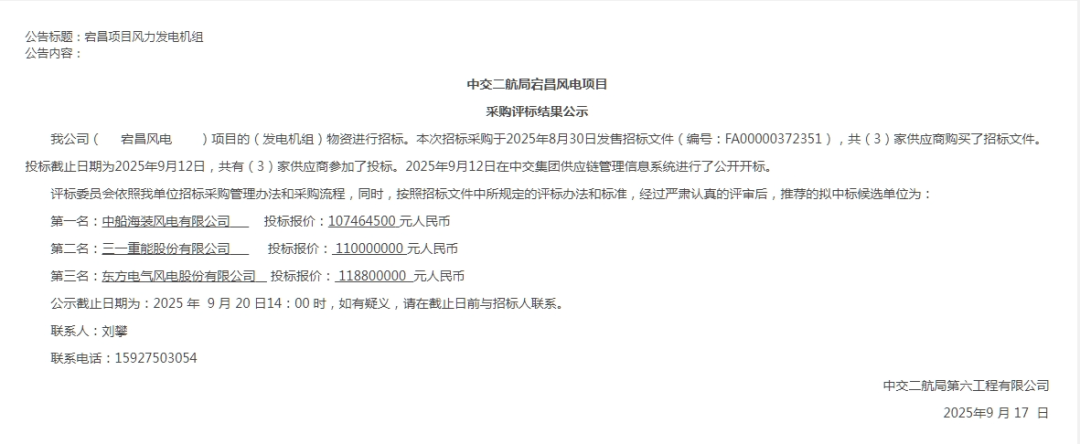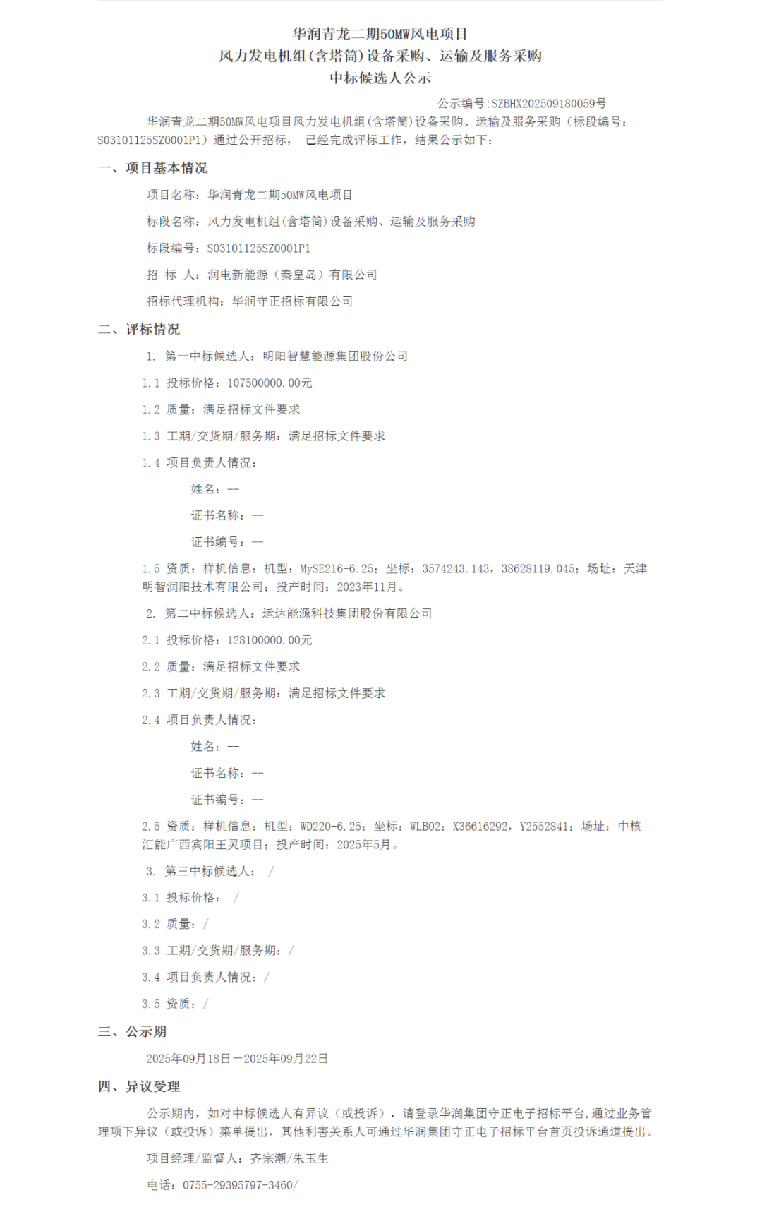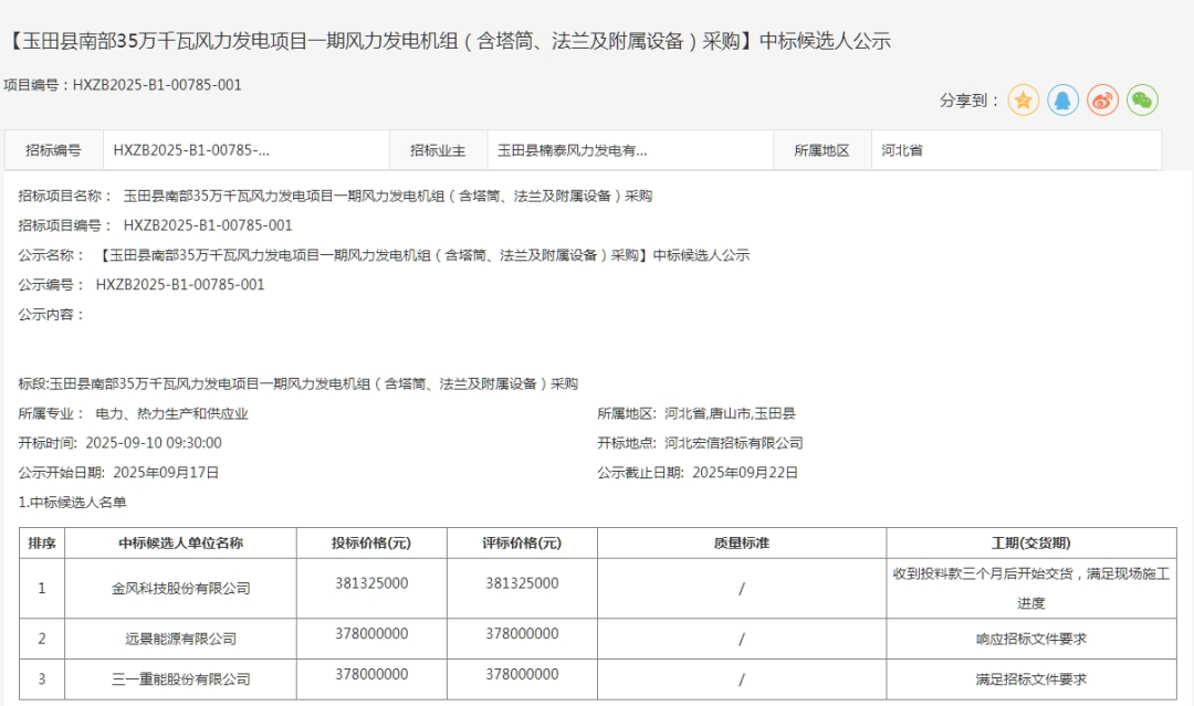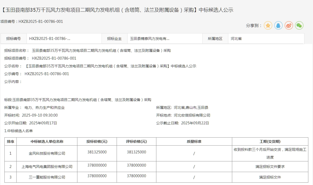 根据公示,明阳智能、东方风电、金风科技、中船海装作为第一中标候选人预中标。