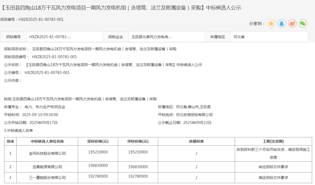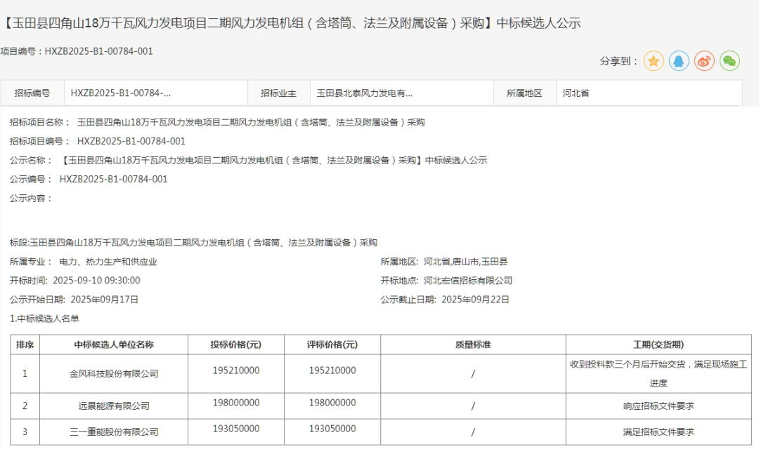 玉田县四角山18万千瓦风力发电项目二期建设地点位于唐山市玉田县玉田镇、林头屯乡、虹桥镇、亮甲店镇,采购风力发电机组(含塔筒、法兰及附属设备),容量90MW,叶轮直径不低于200m(须满足风机安全等级要求),叶尖距地最低距离大于15m。交货时间:分批次交货,首批交货时间2025年11月20日前,剩余根据工程建设情况需要最终交付时间、数量、批次以买方书面通知为准。