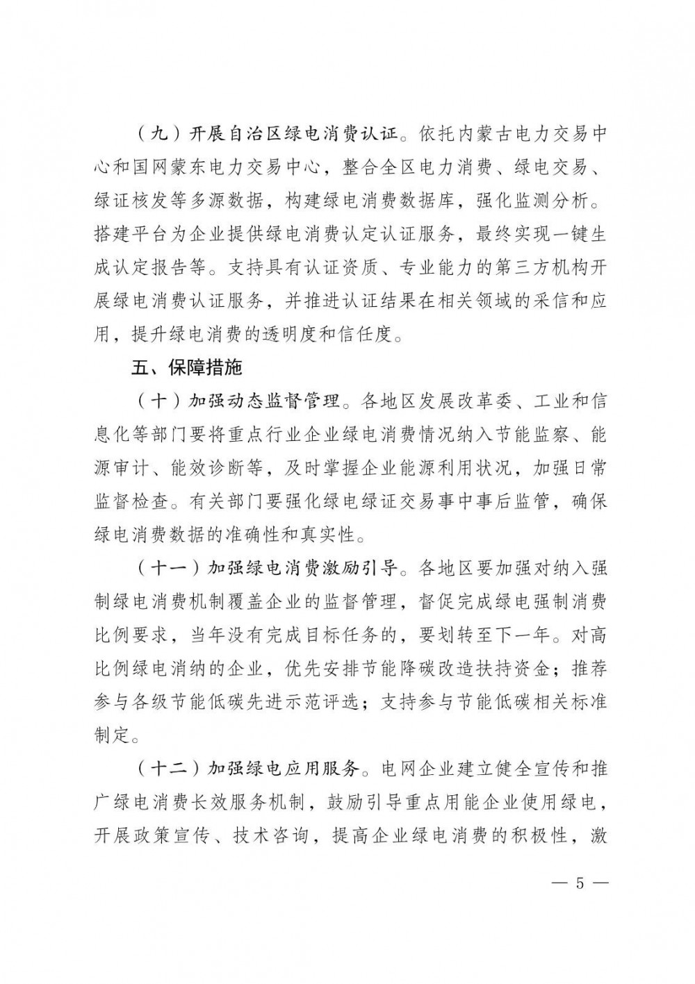 文件提出,严格新上项目绿电强制消费要求。全面实行新上“两高”项目绿电强制消费机制,要求“两高”项目绿电消费比例不低于所在地可再生能源消纳平均水平,并合理提高绿电消费比例要求。支持各盟市新上“两高”项目通过购买绿证绿电进行能耗替代。根据自治区能源发展规划和数据中心布局,新建数据中心绿电消费比例在80%基础上进一步提升。