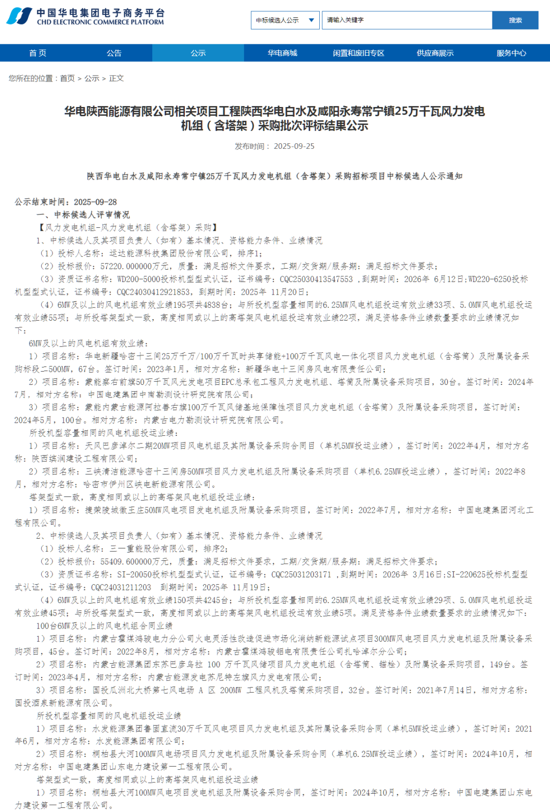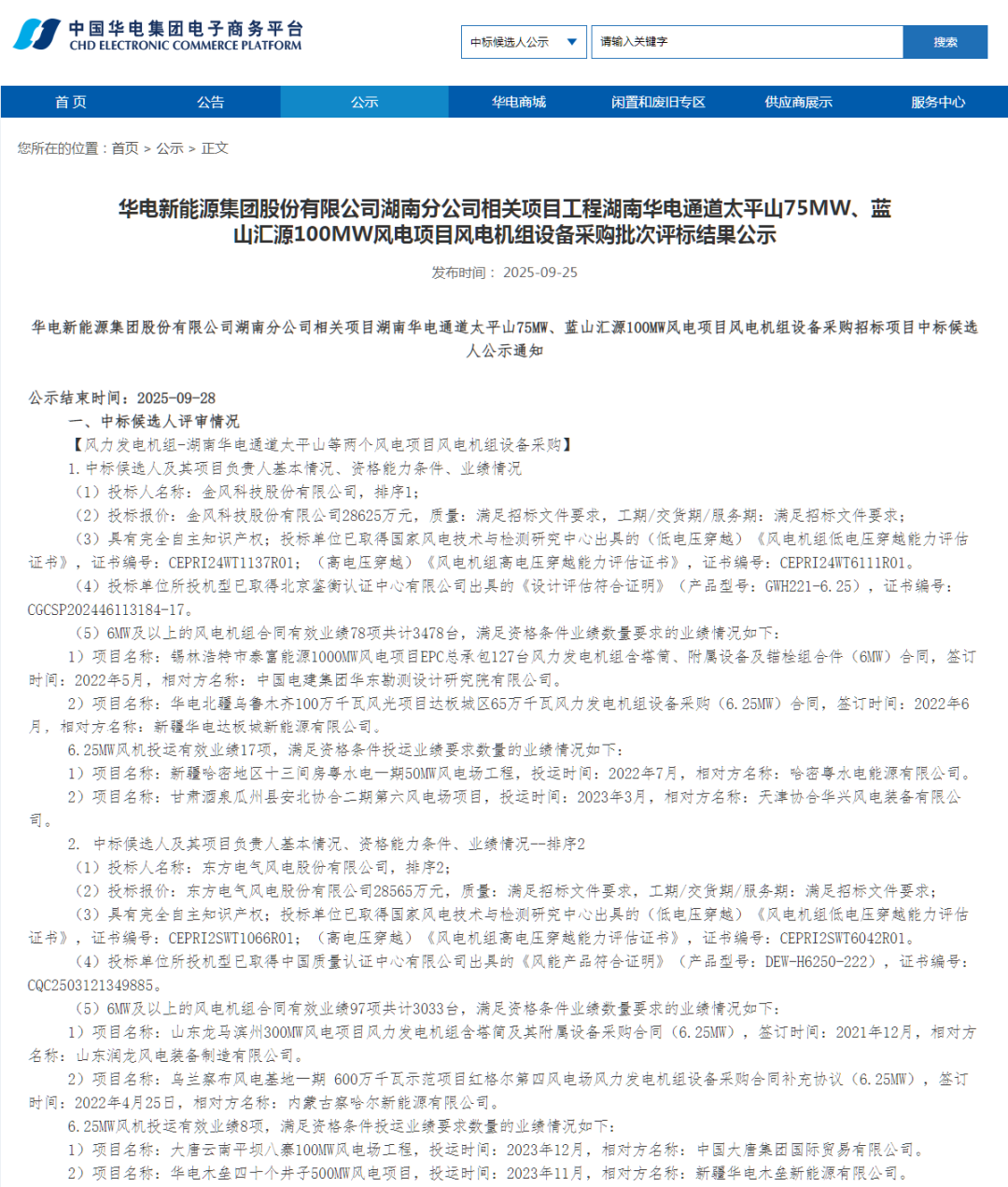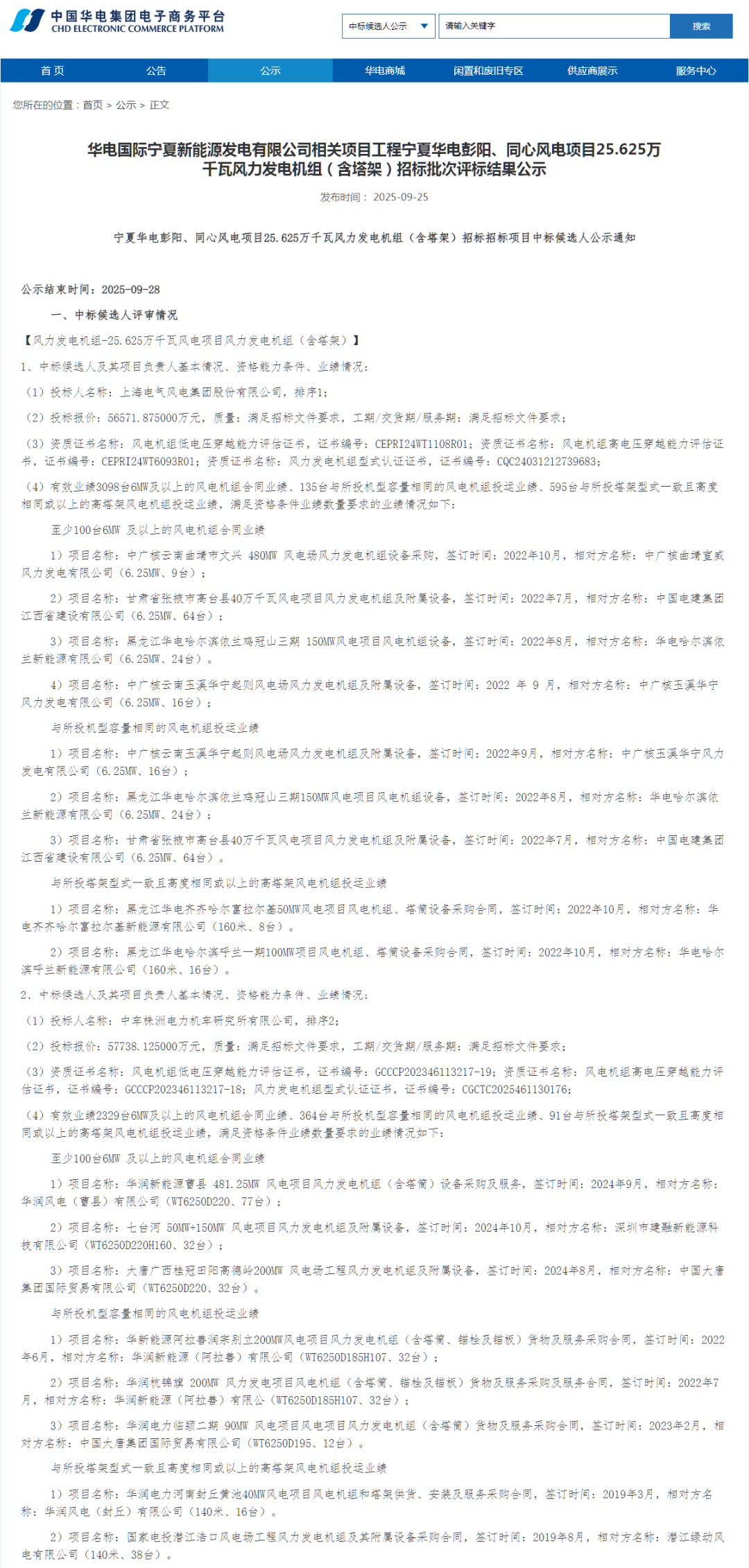 电力家获悉,9月25日,华电集团电子商务平台8个风电项目风电机组采购中标候选人公示,规模合计1565MW。