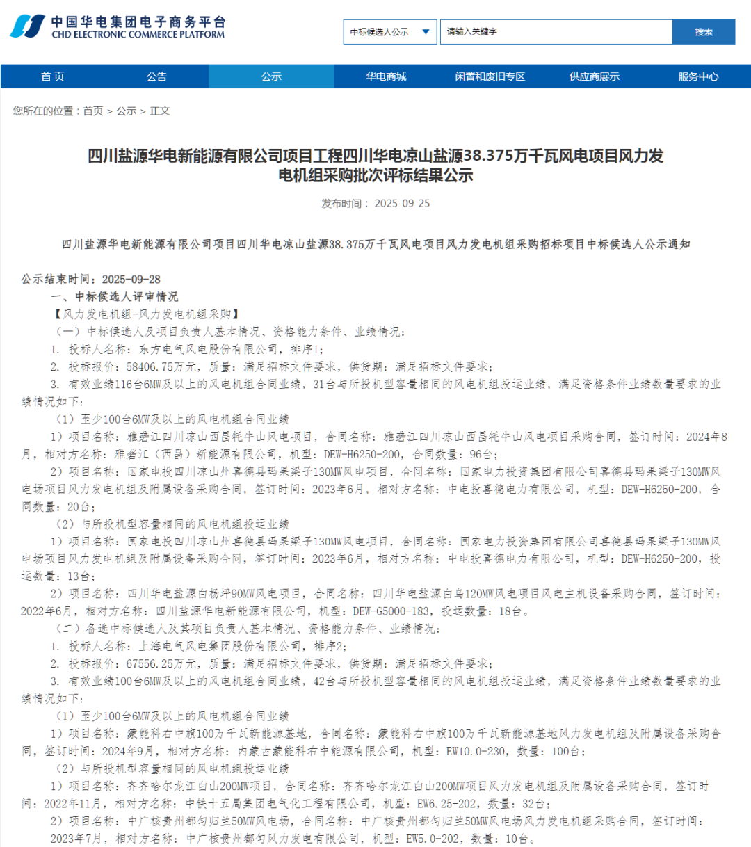 四川华电凉山盐源38.375万千瓦风电项目位于四川省凉山彝族自治州盐源县,总装机容量38.375万千瓦。本次采购范围分别为大河二期风电项目100MW,采购单机容量为6.25MW的风机16台;后龙山二期风电项目100MW,采购单机容量为6.25MW的风机16台;大坝梁子二期风电项目81.25MW,采购单机容量为6.25MW的风机13台;小高山二期风电项目62.5MW,采购单机容量为6.25MW的风机10台;凉风坳二期风电项目40MW,采购单机容量为5.0MW的风机8台。风机设备的供货日期暂定为2025年9月至2026年4月。
