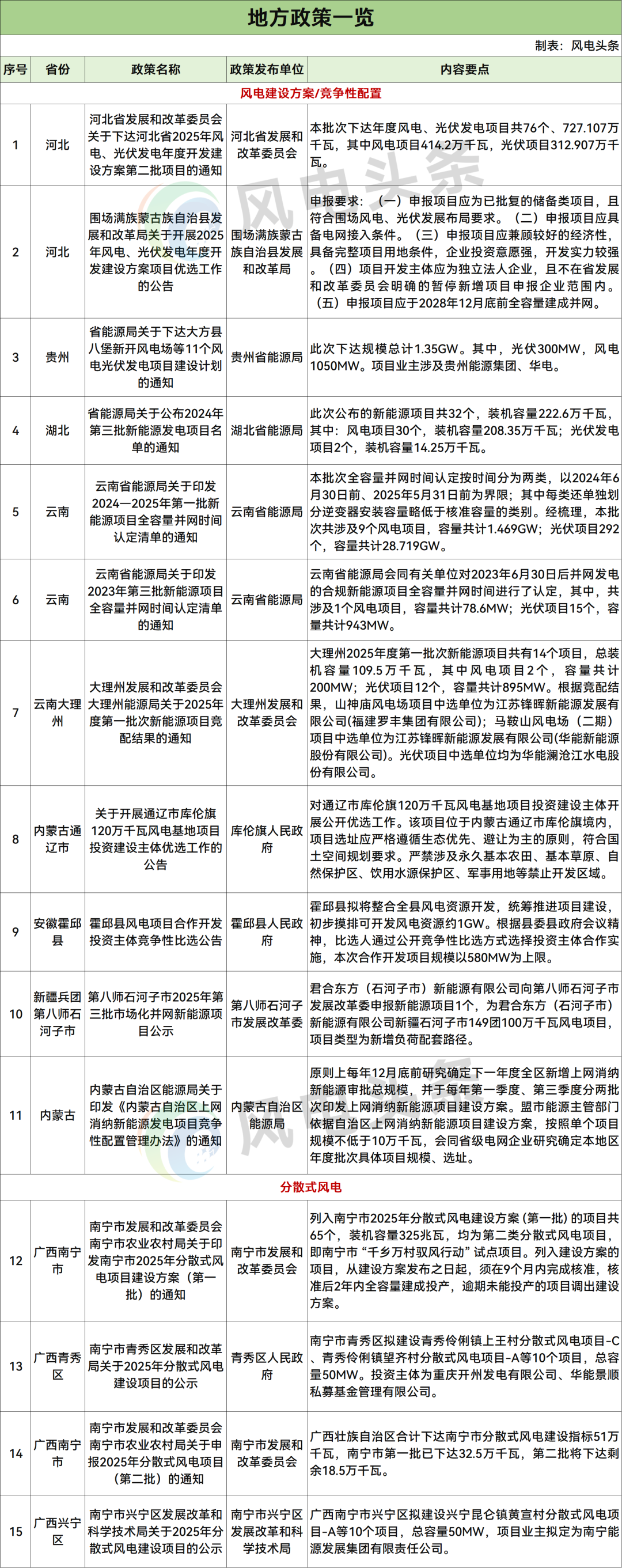 河北、贵州、湖北等9个地方均下发相关文件。河北下达2025年风电、光伏发电年度开发建设方案第二批项目;贵州下达大方县八堡新开风电场等11个风电光伏发电项目建设计划;湖北公布2024年第三批新能源发电项目名单;内蒙古通辽市启动120万千瓦风电基地项目投资建设主体优选。
