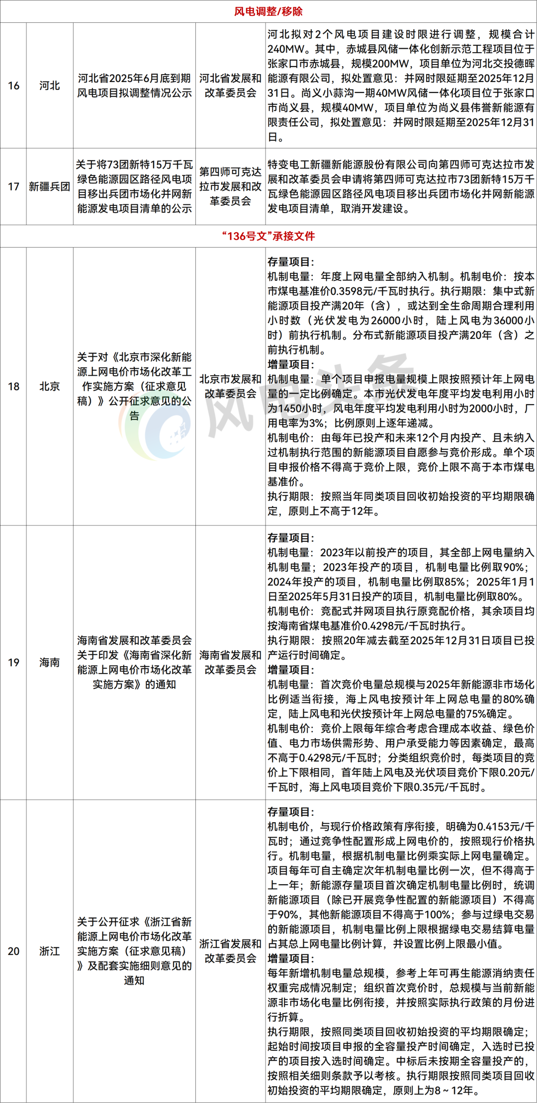 河北公示2025年6月底到期风电项目拟调整情况,拟对2个风电项目建设时限进行调整,规模合计240MW。新疆兵团发布公告称,将73团新特15万千瓦绿色能源园区路径风电项目移出兵团市场化并网新能源发电项目清单。