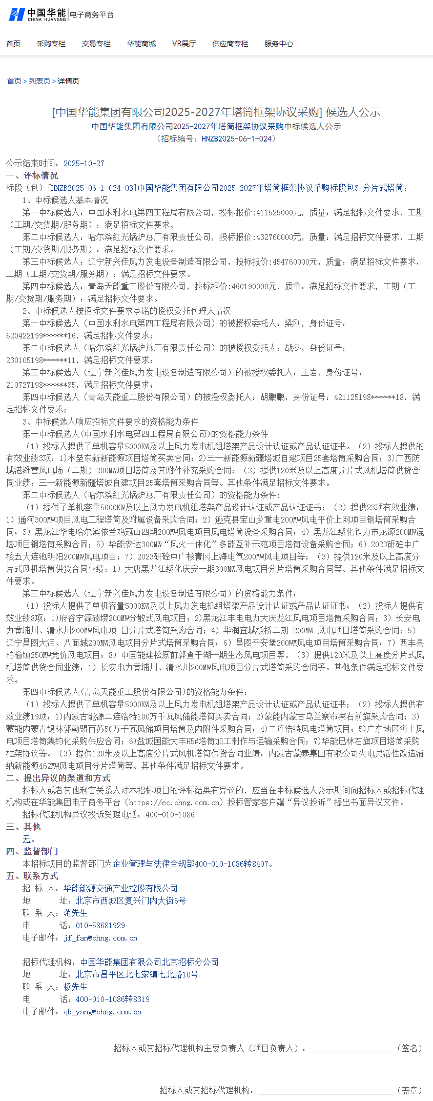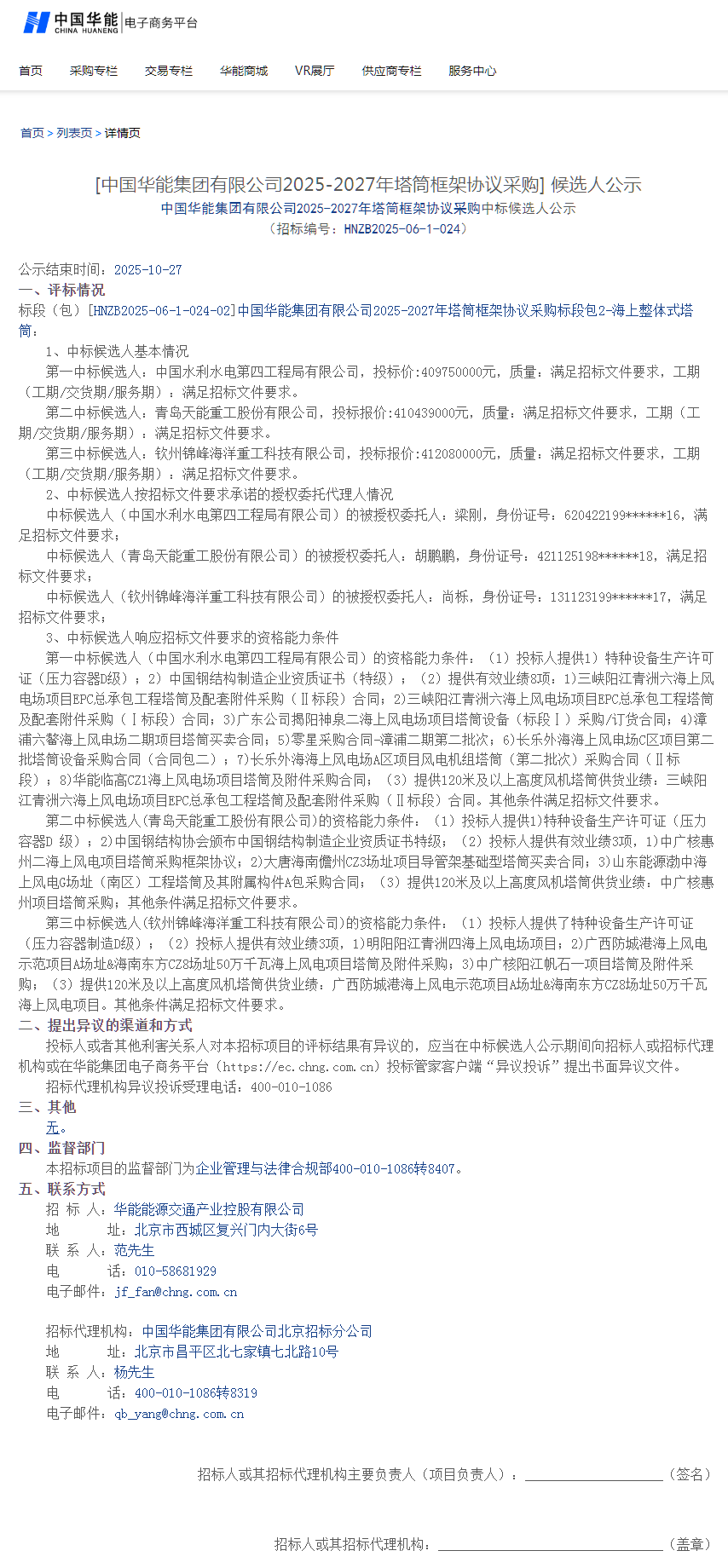 电力家获悉,10月23日,中国华能集团有限公司2025-2027年塔筒框架协议采购候选人公示。