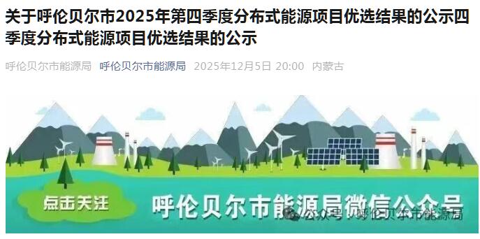 12月5日,呼伦贝尔市能源局发布关于呼伦贝尔市2025年第四季度分布式能源项目优选结果的公示四季度分布式能源项目优选结果的公示。