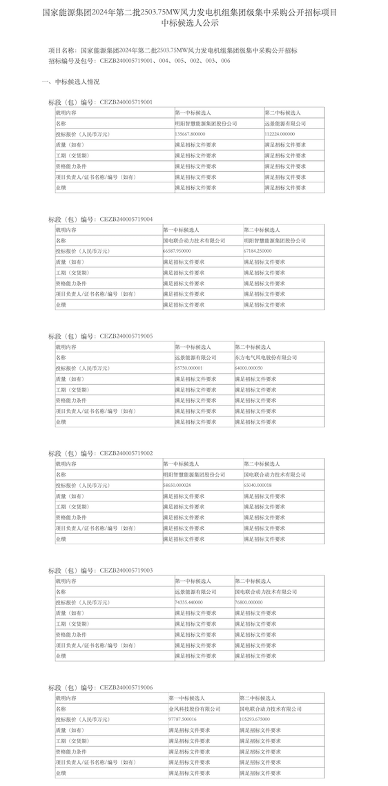 近日,国家能源集团发布《国家能源集团2024年第二批2503.75MW风力发电机组集团级集中采购公开招标中标结果公告》,公告显示,明阳智能、国电联合动力、远景能源、金风科技分别中标上述项目。