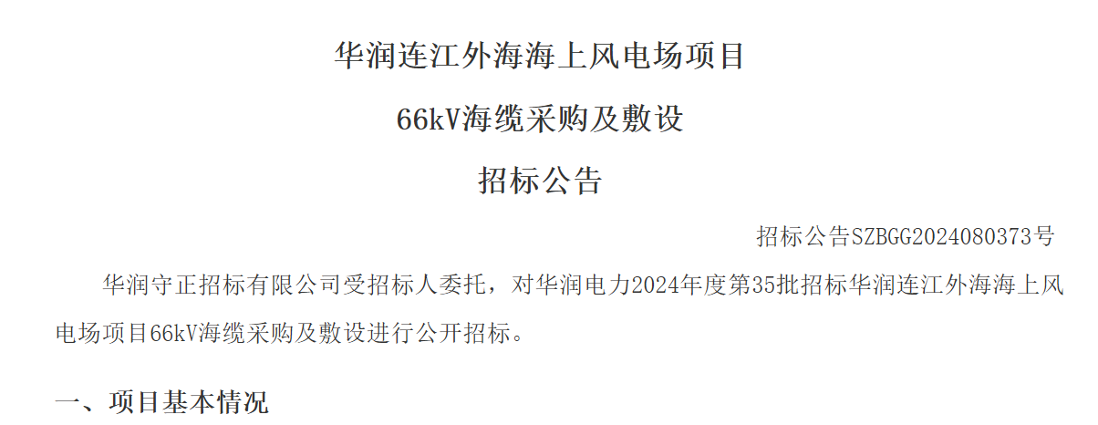 近日,华润集团电子招标采购平台发布华润连江外海海上风电场项目220kV、66kV海缆采购及敷设招标公告。