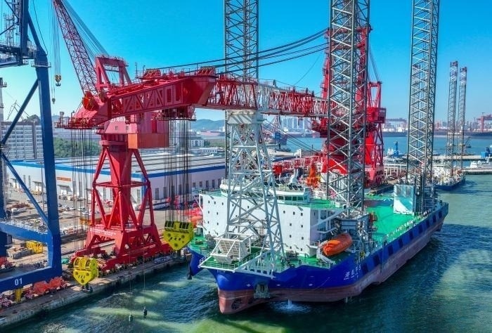8月28日,目前中国起升高度最高、综合起重能力最强、升降桩腿最长的自航自升式海上风电安装平台港航平5在青岛海西重机码头交付。 (天津港集团供图)