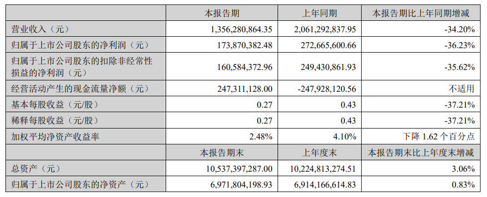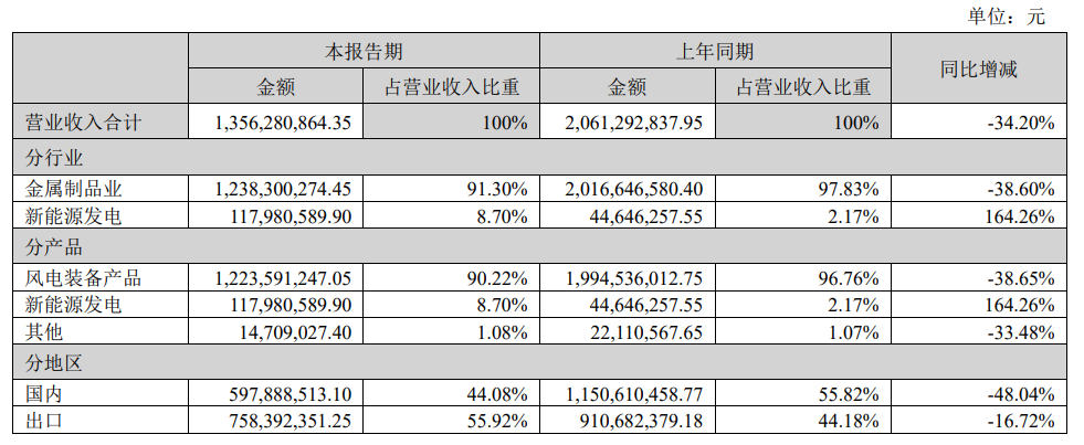 报告披露,2024年上半年,大金重工实现营业收入13.56亿元,同比下34.20%;实现归属于上市公司股东的净利润1.74亿元,同比下降36.23%;实现归属于上市公司股东的扣除非经常性损益的净利润1.61亿元,同比下降35.62%。