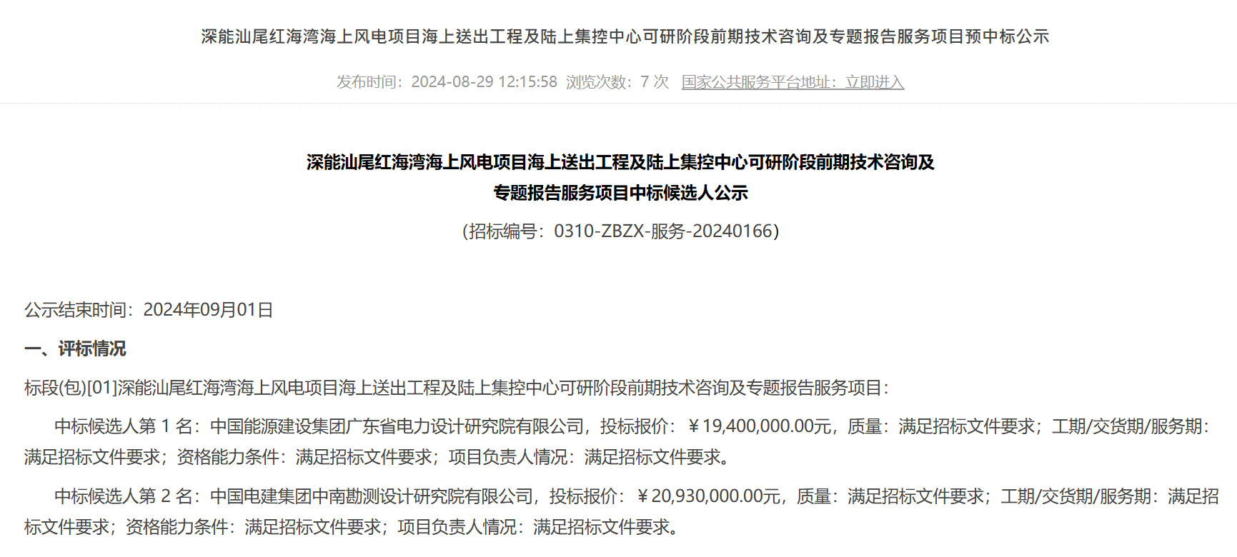 8月29日,深圳能源电子招标投标平台发布《深能汕尾红海湾海上风电项目海上送出工程及陆上集控中心可研阶段前期技术咨询及专题报告服务项目中标候选人公示》的公告。