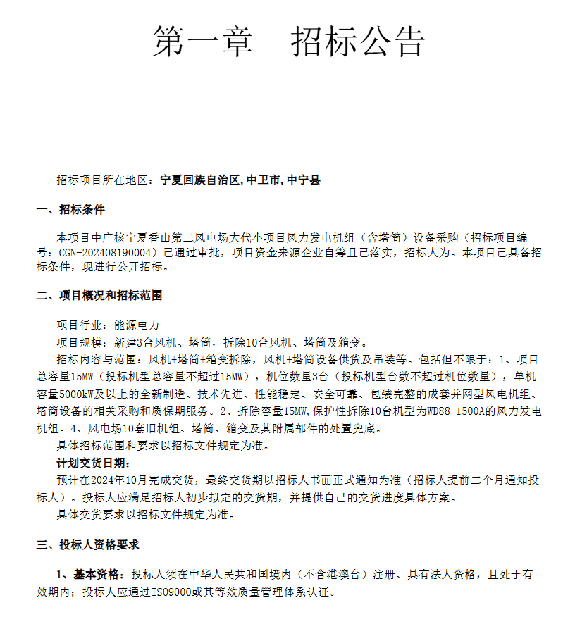 《中广核宁夏香山第二风电场大代小项目风力发电机组(含塔筒)设备采购》显示,该项目位于宁夏中卫市中宁县,项目总容量15MW。招标范围为,风机+塔筒+箱变拆除,风机+塔筒设备供货及吊装等。包括但不限于:1、项目总容量15MW(投标机型总容量不超过15MW),机位数量3台(投标机型台数不超过机位数量),单机容量5000kW及以上的全新制造、技术先进、性能稳定、安全可靠、包装完整的成套并网型风电机组、塔筒设备的相关采购和质保期服务。2、拆除容量15MW,保护性拆除10台机型为WD88-1500A的风力发电机组。4、风电场10套旧机组、塔筒、箱变及其附属部件的处置兜底。