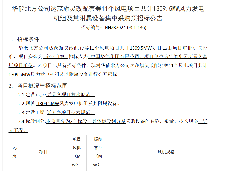 《华能北方公司达茂旗灵改配套等11个风电项目共计1309.5MW风力发电机组及其附属设备集中采购预招标公告》显示,华能此次招标共分为2个标段,总规模为1309.5MW,招标范围不含塔筒。其中包括2个驭风行动项目,共100MW。