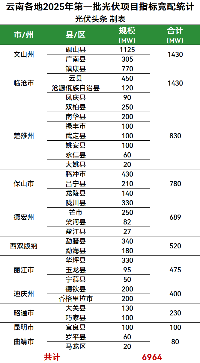 光伏头条梳理后发现,2025年至今,云南已经有72个光伏项目完成竞争性配置,总规模为6.964GW,涉及文山州、临沧市、楚雄州、保山市、德宏州、西双版纳、丽江市、迪庆州、昭通市、昆明市、曲靖市11市/州。