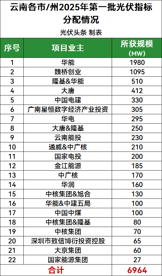 项目业主方面,华能、魏桥创业、隆基华能、大唐、中国电建、广南星恒数字经济产业投资、华电、大唐隆基、云南能投、通威中广核、国家电投、金江能源、中广核、华润、中核集团旭合、华能中建五局、中国中煤、中核集团隆基、中核集团、深圳市致信博衍投资控股、大京集团、国家能源集团等22家企业或联合体获得光伏指标。