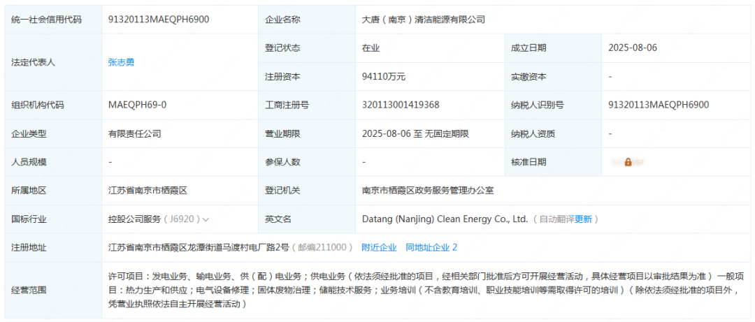 光伏头条获悉,企查查显示,近日,大唐(南京)清洁能源有限公司成立,法定代表人为张志勇,注册资本为94110万元。经营范围包含发电业务、输电业务、供(配)电业务;供电业务等。