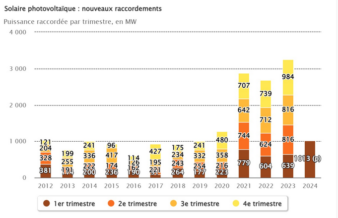 图1法国从2012年第一季度到2024年第一季度安装的光伏系统(MW)