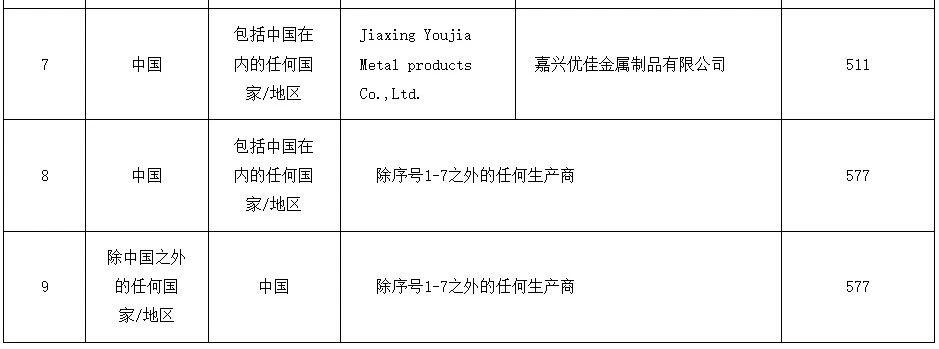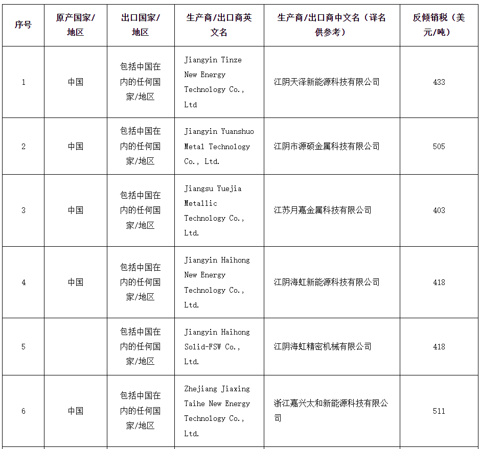 2024年6月29日,印度商工部发布公告,对原产于或进口自中国的用于太阳能电池板/组件的铝边框(Aluminium frame for solar panels/modules)作出反倾销肯定性终裁,建议对中国的涉案产品征收为期5年的反倾销税,税额为403577美元/吨,征税详情见附表。本案涉及印度海关编码76109010、76109030和76169990项下的产品。