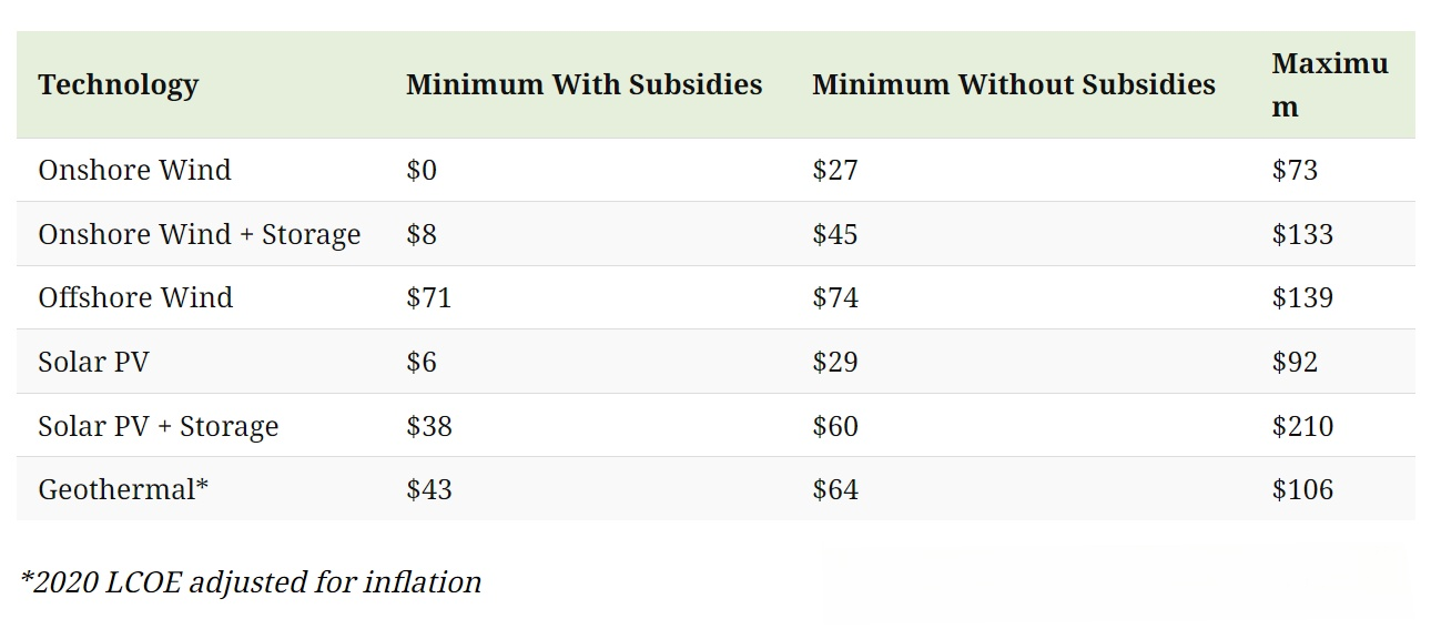 如果申请到《通胀削减法案》(IRA)中包含的补贴(如投资税收抵免ITC、生产税收抵免PTC和能源社区附加费ECA),美国陆上风电的成本实际上可低至每兆瓦时0美元。