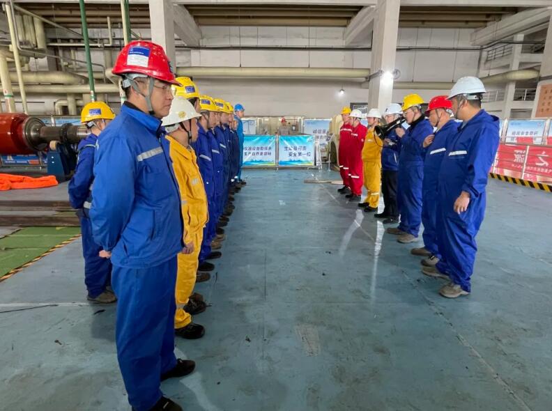 上午9时00分,随着起重指挥人员一声哨响,发电机穿转子作业正式开始。穿装过程中,各专业人员分工明确、配合默契,全程密切关注转子与定子间隙,及时调整穿入量与中心位置,确保每一步操作精准无误。作业期间,南京公司技术总监龙劲强在现场监督指导,南京公司EHS部副部长杨明、设备管理党支部书记王剑文带领支部党员先锋队——包括电气、汽机及特种设备专业党员全程旁站监督,为穿转子工作的顺利推进提供了有力保障。