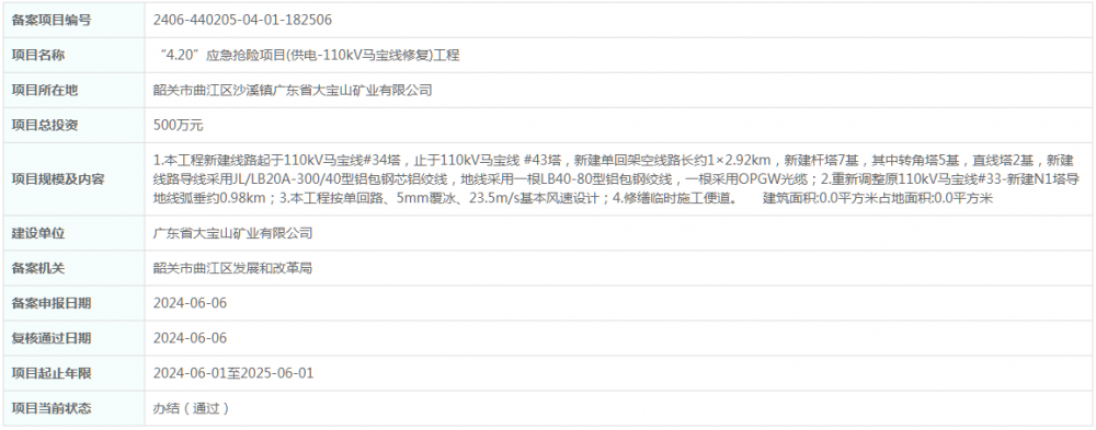 据悉,该项目位于韶关市曲江区沙溪镇广东省大宝山矿业有限公司,项目总投资500万元,建设单位为广东省大宝山矿业有限公司。工程新建线路起于110kV马宝线#34塔,止于110kV马宝线 #43塔,新建单回架空线路长约1×2.92km,新建杆塔7基,其中转角塔5基,直线塔2基,新建线路导线采用JL/LB20A-300/40型铝包钢芯铝绞线,地线采用一根LB40-80型铝包钢绞线,一根采用OPGW光缆;重新调整原110kV马宝线#33-新建N1塔导地线弧垂约0.98km;3.本工程按单回路、5mm覆冰、23.5m/s基本风速设计;4.修缮临时施工便道。建筑面积:0.0平方米占地面积:0.0平方米