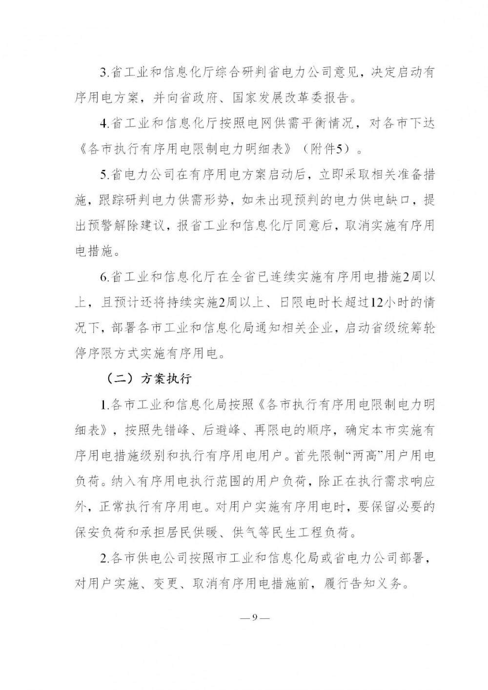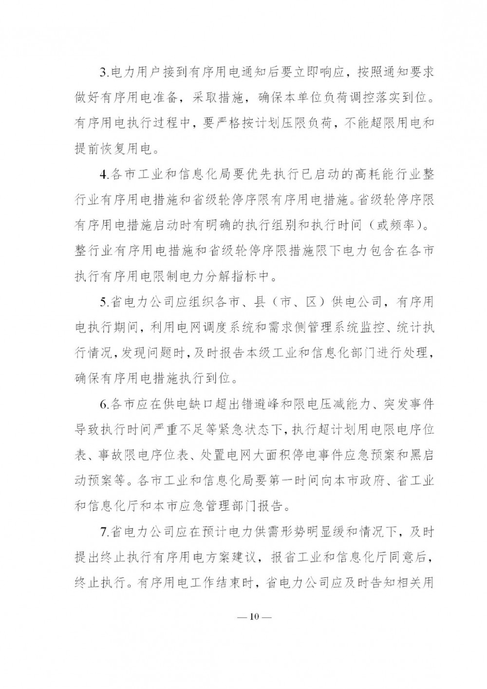 当全省范围内,出现长时间、大负荷有序用电时,省内部分企业以轮替停产(简称轮停)或有序轮替限制部分生产负荷(简称序限)的方式实施有序用电。由于全省各市“两高”用户分布地区差异明显,本年度由各市统筹本地区“两高”用户执行有序用电措施,首先限制本地区“两高”用户用电需求。当负荷缺口大且持续长时,省工业和信息化厅可以在综合研判出负荷缺口趋势基础上,决定针对个别高耗能行业整行业实施有序用电措施。