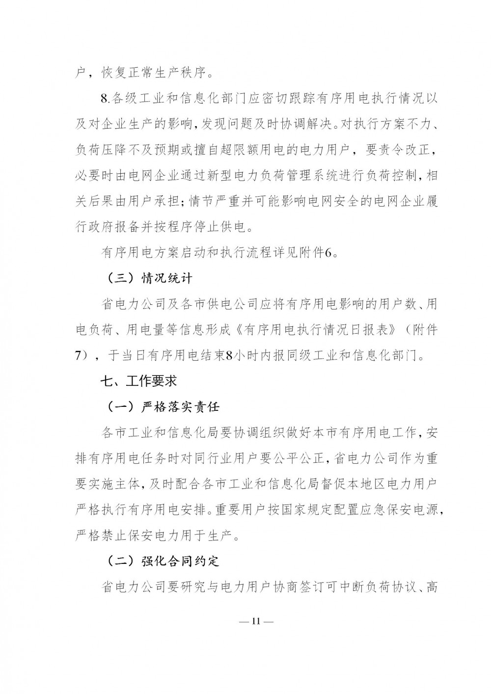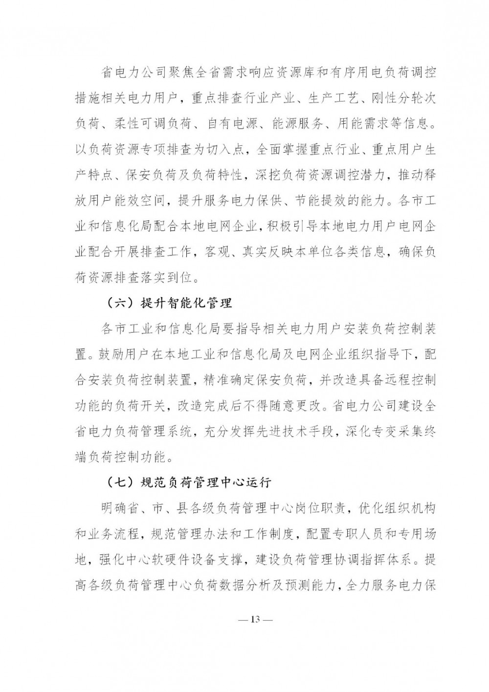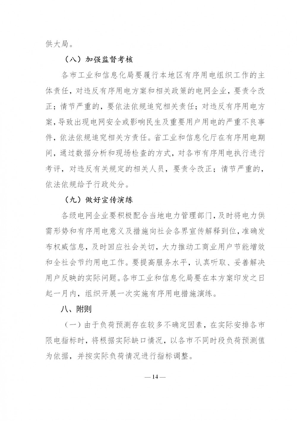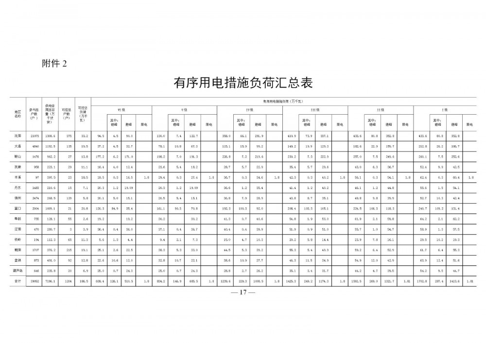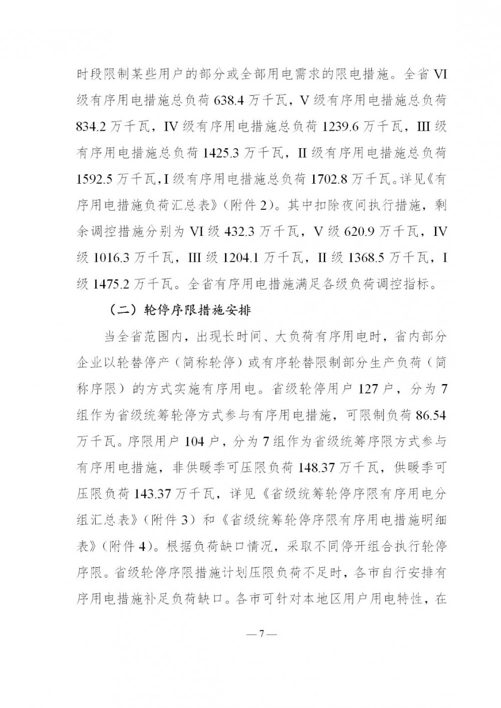内容指出,有序用电措施包括高峰时段用电负荷转移到其他时段的错峰措施,高峰时段削减、中断或停止用电负荷的避峰措施和特定时段限制某些用户的部分或全部用电需求的限电措施。全省VI级有序用电措施总负荷638.4万千瓦,V级有序用电措施总负荷834.2万千瓦,IV级有序用电措施总负荷1239.6万千瓦,III级有序用电措施总负荷1425.3万千瓦,II级有序用电措施总负荷1592.5万千瓦,I级有序用电措施总负荷1702.8万千瓦。