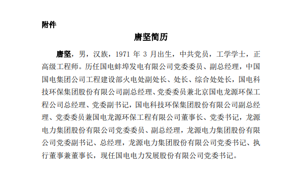 据电力家了解到,5月25日,国电电力发布公告宣布, 因工作原因,贾彦兵辞去公司董事、总经理以及战略与 ESG 管理委员会委员职务,罗梅健辞去公司董事、副总经理以及战略与 ESG 管理委员会委员职务。同日公告宣布,提名唐坚为公司第八届董事会董事候选人,并任董事会战略与 ESG 管理委员会委员候选人。