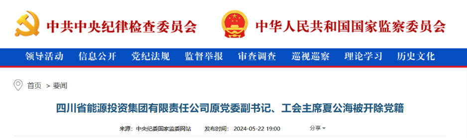 据电力家了解到,中央纪委国家监委网站5月22日消息,据四川省纪委监委消息:日前,经四川省委批准,四川省纪委监委对四川省能源投资集团有限责任公司原党委副书记、工会主席夏公海严重违纪违法问题进行了立案审查调查。
