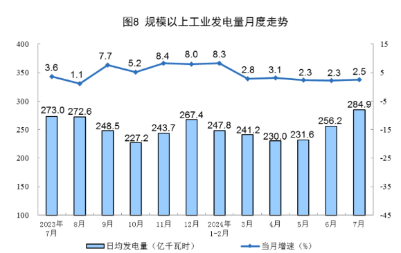 7月份,规上工业发电量8831亿千瓦时,同比增长2.5%,增速比6月份加快0.2个百分点;规上工业日均发电284.9亿千瓦时。1—7月份,规上工业发电量53239亿千瓦时,同比增长4.8%。