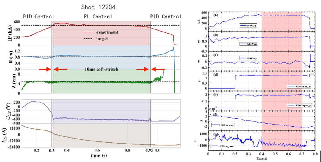 典型智能控制实验中,等离子体电流的控制偏差小于10kA,等离子体水平位置(R)的控制偏差小于2cm ,并在近期成功实现了对形状参数Rmax和拉长比的控制。
