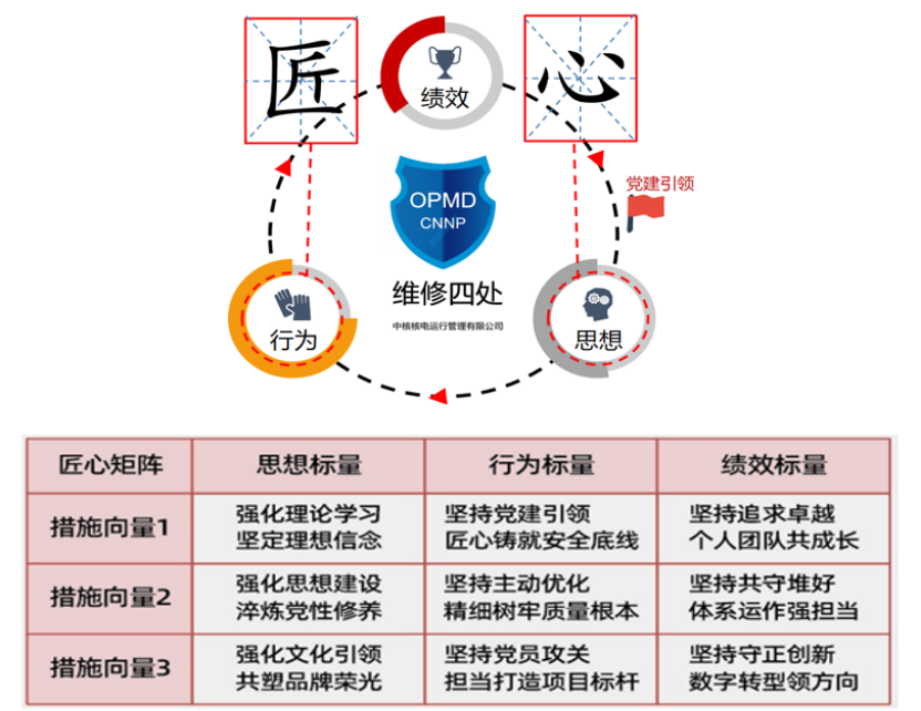 秦山核电维修四处长期致力于部门核安全文化建设,通过三个强化、六个坚持系列举措,实现党建工作与核安全文化建设的有机融合。处室积极落实中核集团核安全文化863动作要领,致力于构建以党建为引领、以核安全文化为基础的维修安全体系,创建了思想、行为、绩效党建模型,倡导并践行思想引领行为、行为创造绩效、绩效提升思想的良性循环。基于秦山核电公司责任、安全、创新、协同的核心价值观,部门凝练出匠心、担当、卓越、成长为核心的价值追求和三个强化、六个坚持匠心矩阵具体举措,将核安全文化建设原则和要素有效融入其中,有力推动核安全文化在组织与员工层面的落地。