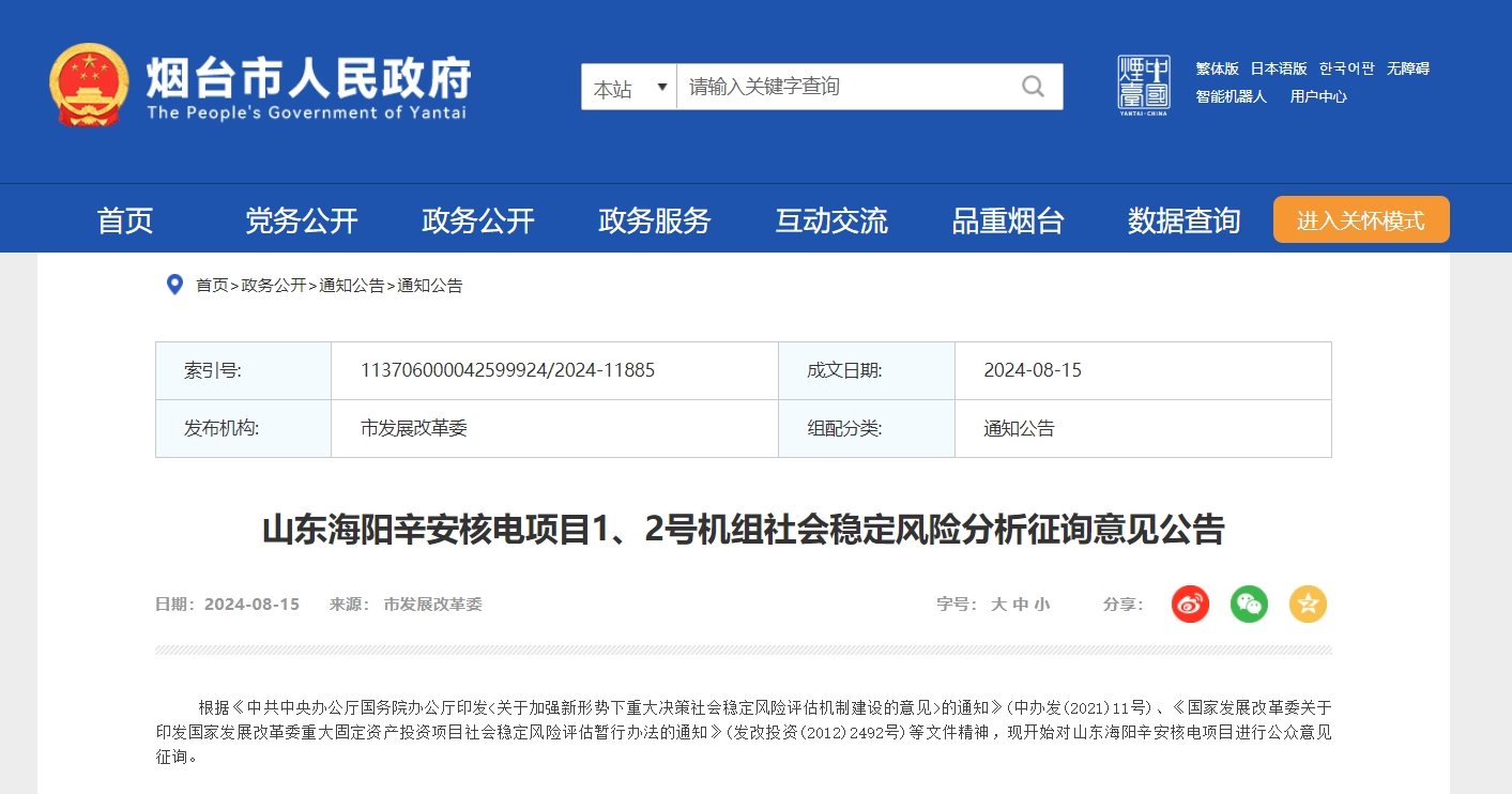 8月15日,烟台市人民政府网站发布《山东海阳辛安核电项目1、2号机组社会稳定风险分析征询意见公告》。