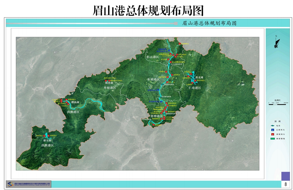 从空间布局来看,结合港口交通条件、城市空间规划、产业集群分布和区域经济发展需求等特点,眉山港被划定为彭山、东坡、青神、仁寿、洪雅和丹棱6个港区,形成“一港六区、一江四湖” 的空间发展格局。