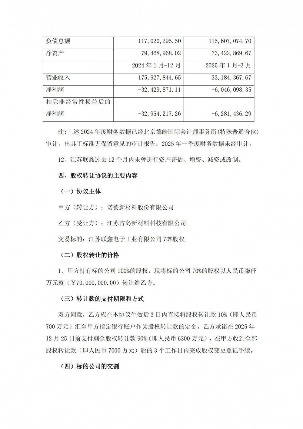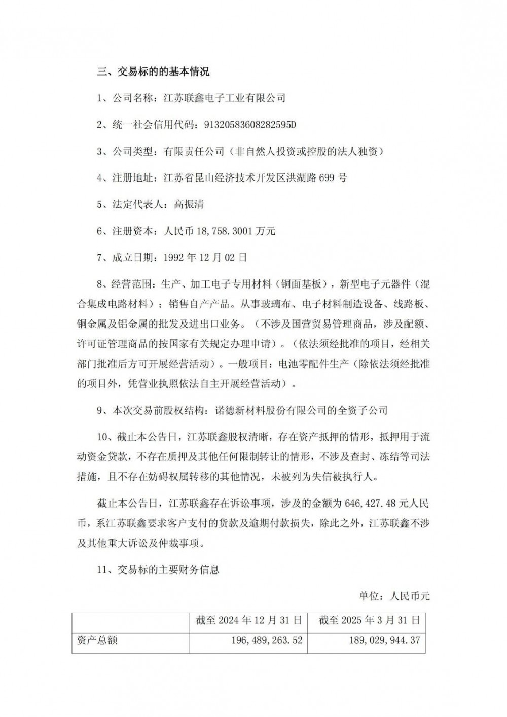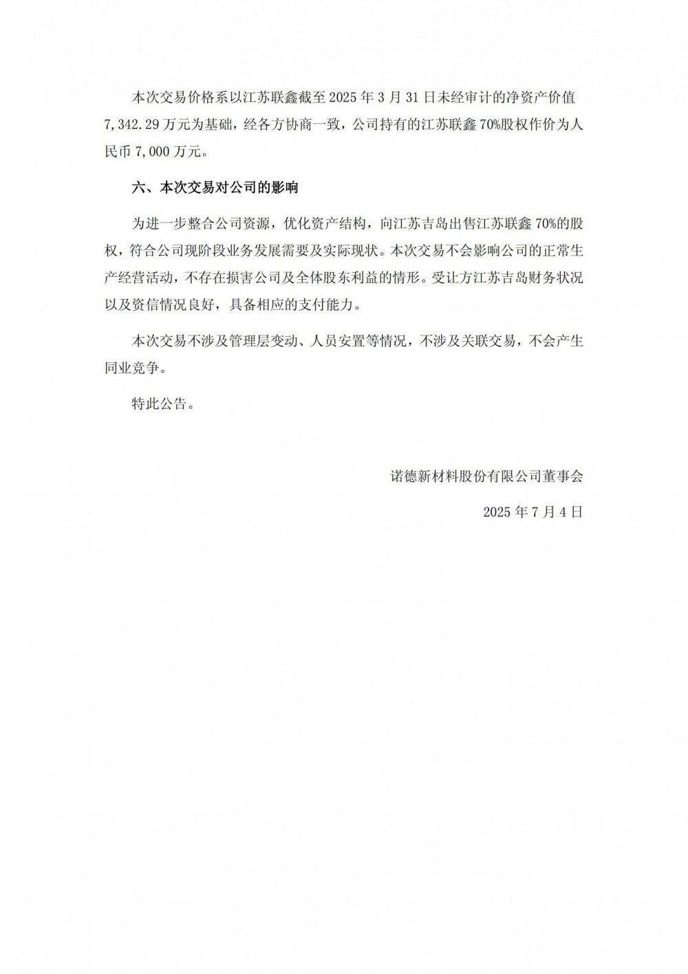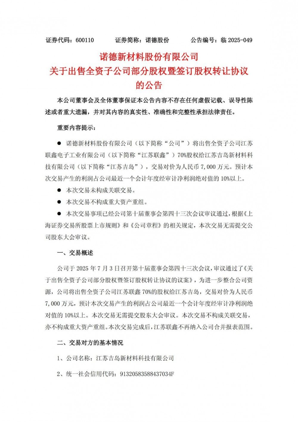 7月3日,诺德股份发布公告称,公司将出售全资子公司江苏联鑫电子工业有限公司70%股权给江苏吉岛新材料科技有限公司,交易对价为人民币7,000万元。预计本次交易产生的利润占公司最近一个会计年度经审计净利润绝对值的10%以上。