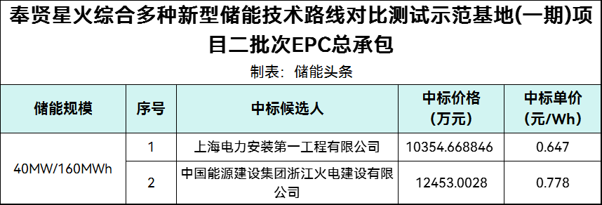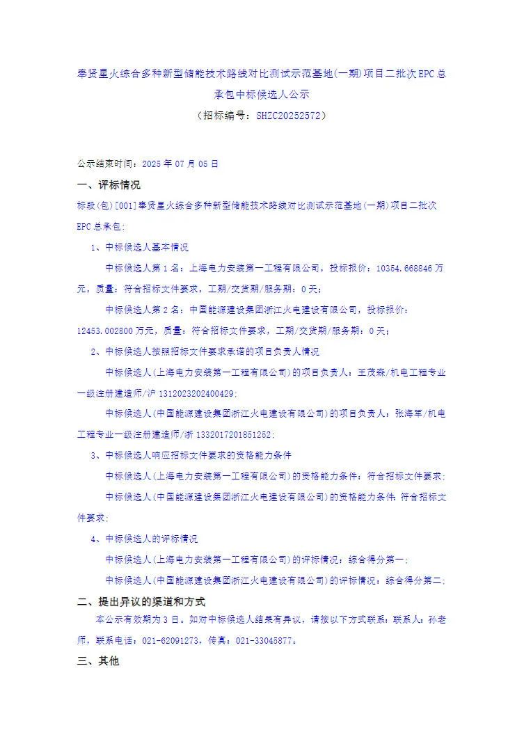 第一中标候选人为上海电力安装第一工程有限公司,投标报价10354.668846万元,折合单价0.647元/Wh;第二中标候选人为中国能源建设集团浙江火电建设有限公司,投标报价12453.0028万元,折合单价0.778元/Wh。