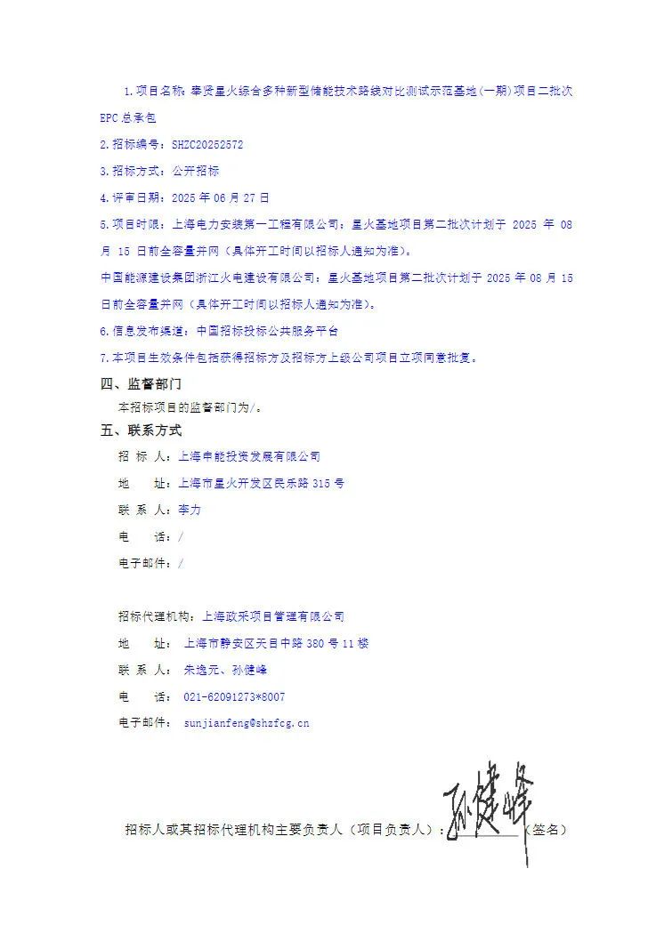 储能头条获悉,近日,奉贤星火综合多种新型储能技术路线对比测试示范基地(一期)项目二批次EPC总承包中标候选人公示。
