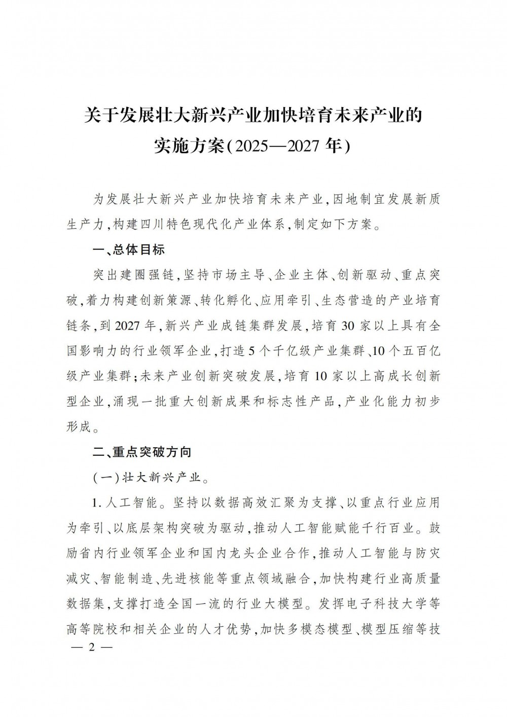 四川省人民政府办公厅印发《关于发展壮大新兴产业加快培育未来产业的实施方案(2025—2027年)》的通知
