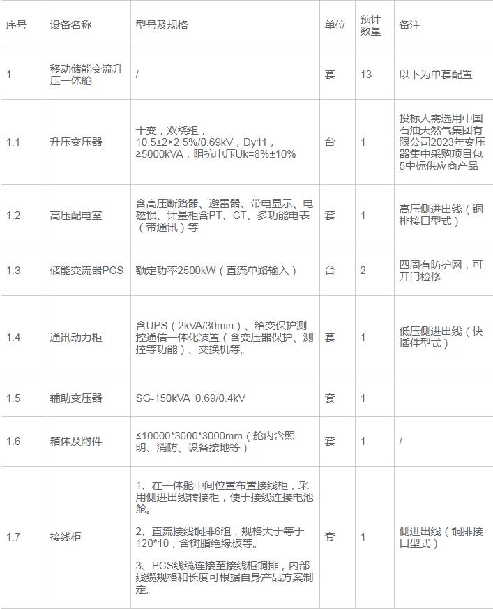 13套5MW移动储能变流升压一体舱所需设备的供货及指导安装,包括PCS、变压器、通讯动力柜、高压配电室、辅助变压器、箱体及附件、备品备件、专用工具等