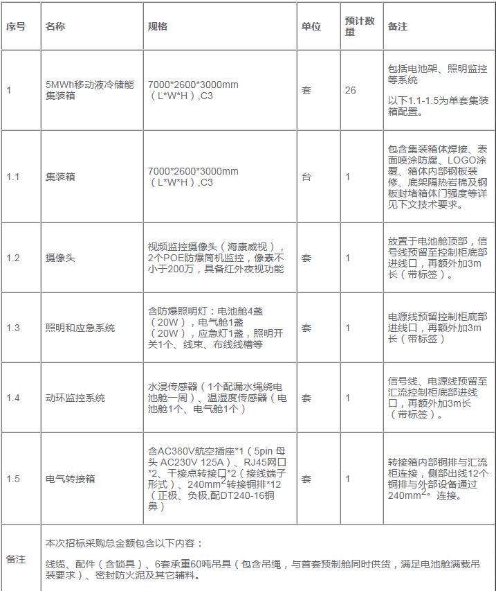 表1. 5MWh移动液冷储能集装箱招标采购范围