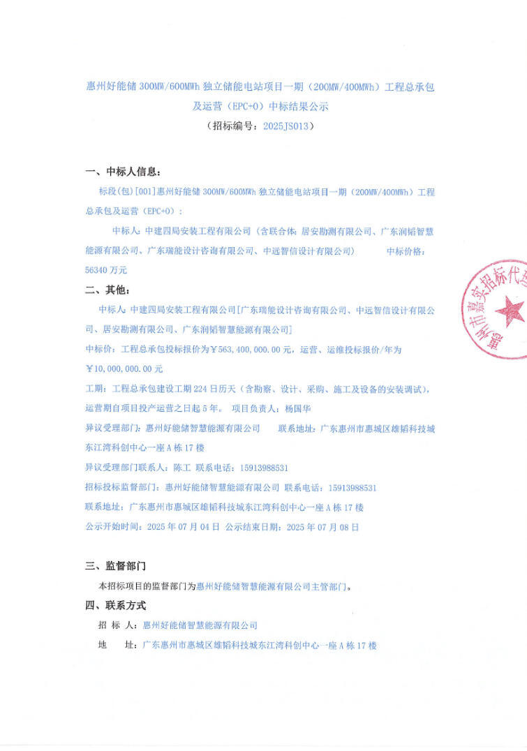 7月4日,惠州好能储300MW/600MWh独立储能电站项目一期(200MW/400MWh)工程总承包及运营(EPC+O)中标结果公示。中建四局安装工程有限公司、居安勘测有限公司、广东润韬智慧能源有限公司、广东瑞能设计咨询有限公司、中远智信设计有限公司联合体以56340万元中标该项目,折合单价0.939元/Wh。
