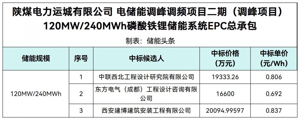 第一中标候选人为中联西北工程设计研究院有限公司,投标报价19333.26万元,折合单价0.806元/Wh;第二中标候选人为东方电气(成都)工程设计咨询有限公司,投标报价16600万元,折合单价0.692元/Wh;第三中标候选人为西安建博建筑安装工程有限公司,投标报价20094.99597万元,折合单价0.837元/Wh。
