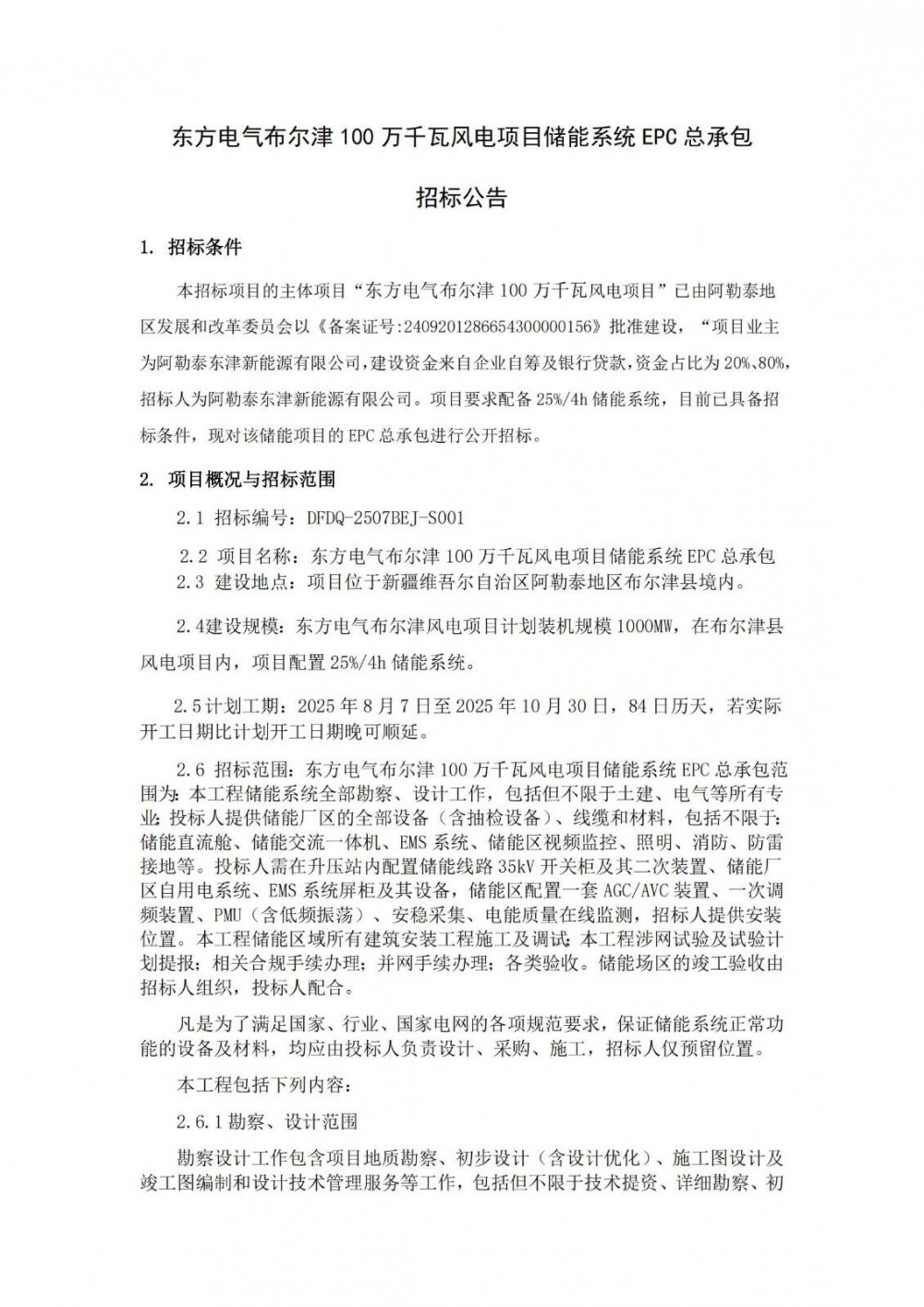 7月7日,东方电气布尔津100万千瓦风电项目储能系统EPC总承包招标公告发布。