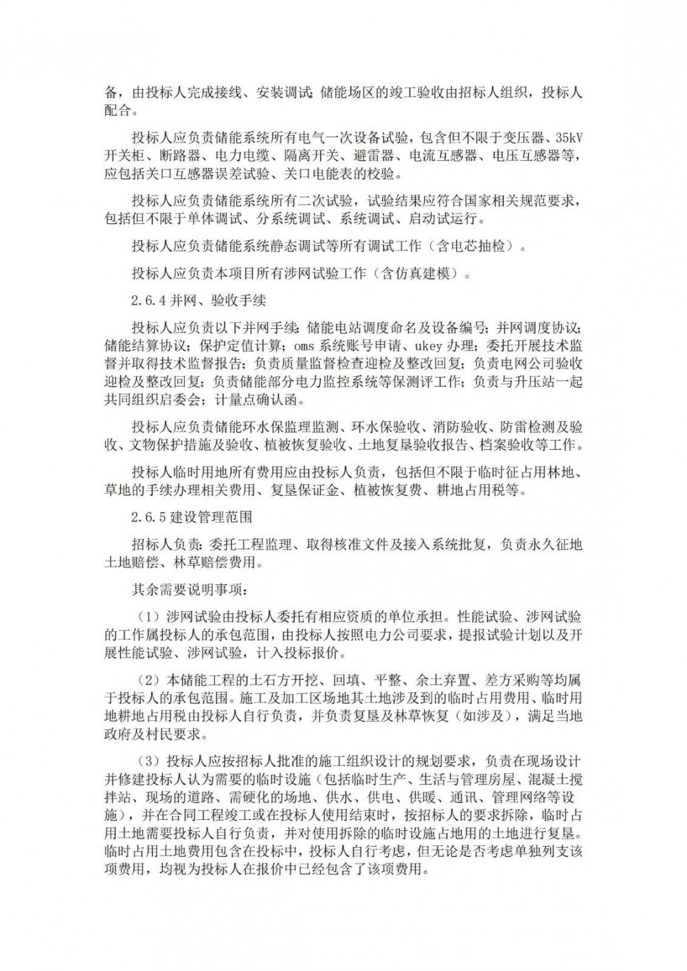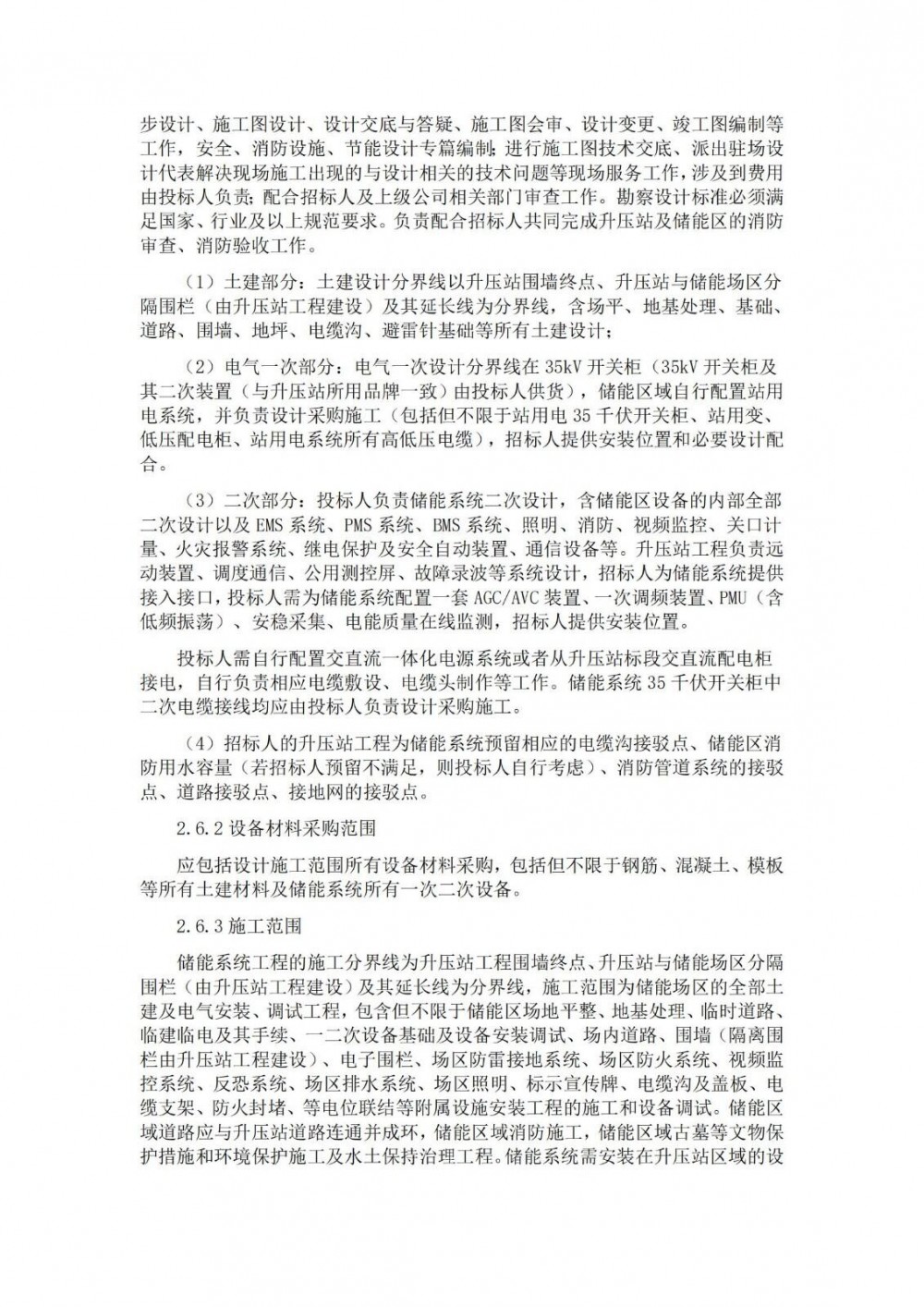 东方电气布尔津100万千瓦风电项目储能系统EPC总承包范围为:本工程储能系统全部勘察、设计工作,包括但不限于土建、电气等所有专业;投标人提供储能厂区的全部设备(含抽检设备)、线缆和材料,包括不限于:储能直流舱、储能交流一体机、EMS系统、储能区视频监控、照明、消防、防雷接地等。投标人需在升压站内配置储能线路35kV开关柜及其二次装置、储能厂区自用电系统、EMS系统屏柜及其设备,储能区配置一套AGC/AVC装置、一次调频装置、PMU(含低频振荡)、安稳采集、电能质量在线监测,招标人提供安装位置。本工程储能区域所有建筑安装工程施工及调试;本工程涉网试验及试验计划提报;相关合规手续办理;并网手续办理;各类验收。储能场区的竣工验收由招标人组织,投标人配合。凡是为了满足国家、行业、国家电网的各项规范要求,保证储能系统正常功能的设备及材料,均应由投标人负责设计、采购、施工,招标人仅预留位置。