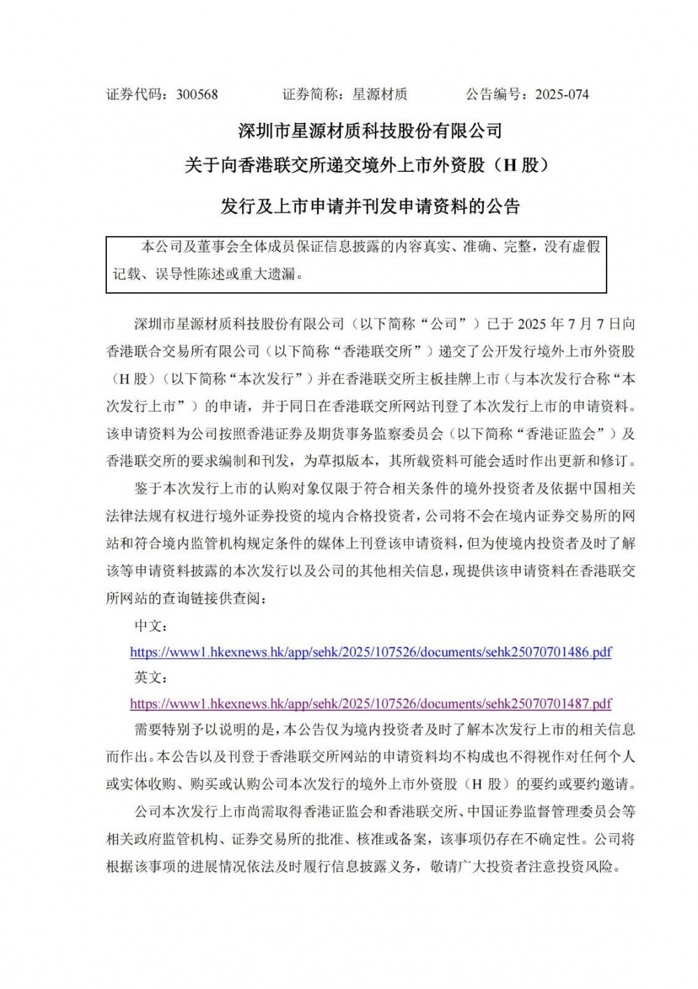 7月7日,星源材质发布公告称,公司已于2025年7月7日向香港联交所递交了公开发行境外上市外资股(H股)并在香港联交所主板挂牌上市的申请,并于同日在香港联交所网站刊登了本次发行上市的申请资料。该申请资料为公司按照香港证券及期货事务监察委员会及香港联交所的要求编制和刊发,为草拟版本,其所载资料可能会适时作出更新和修订。