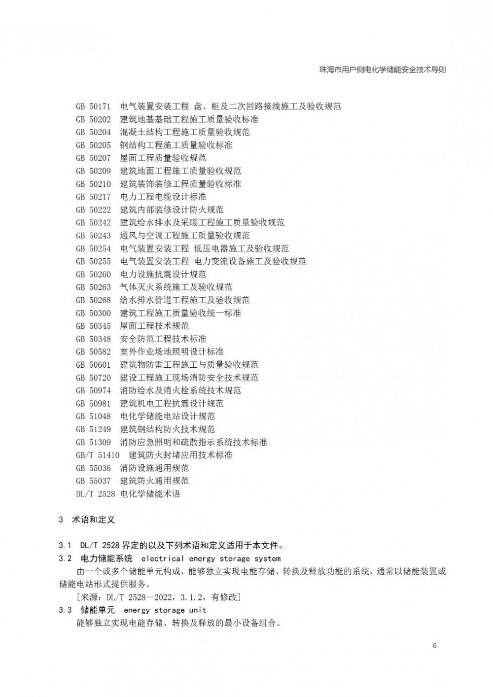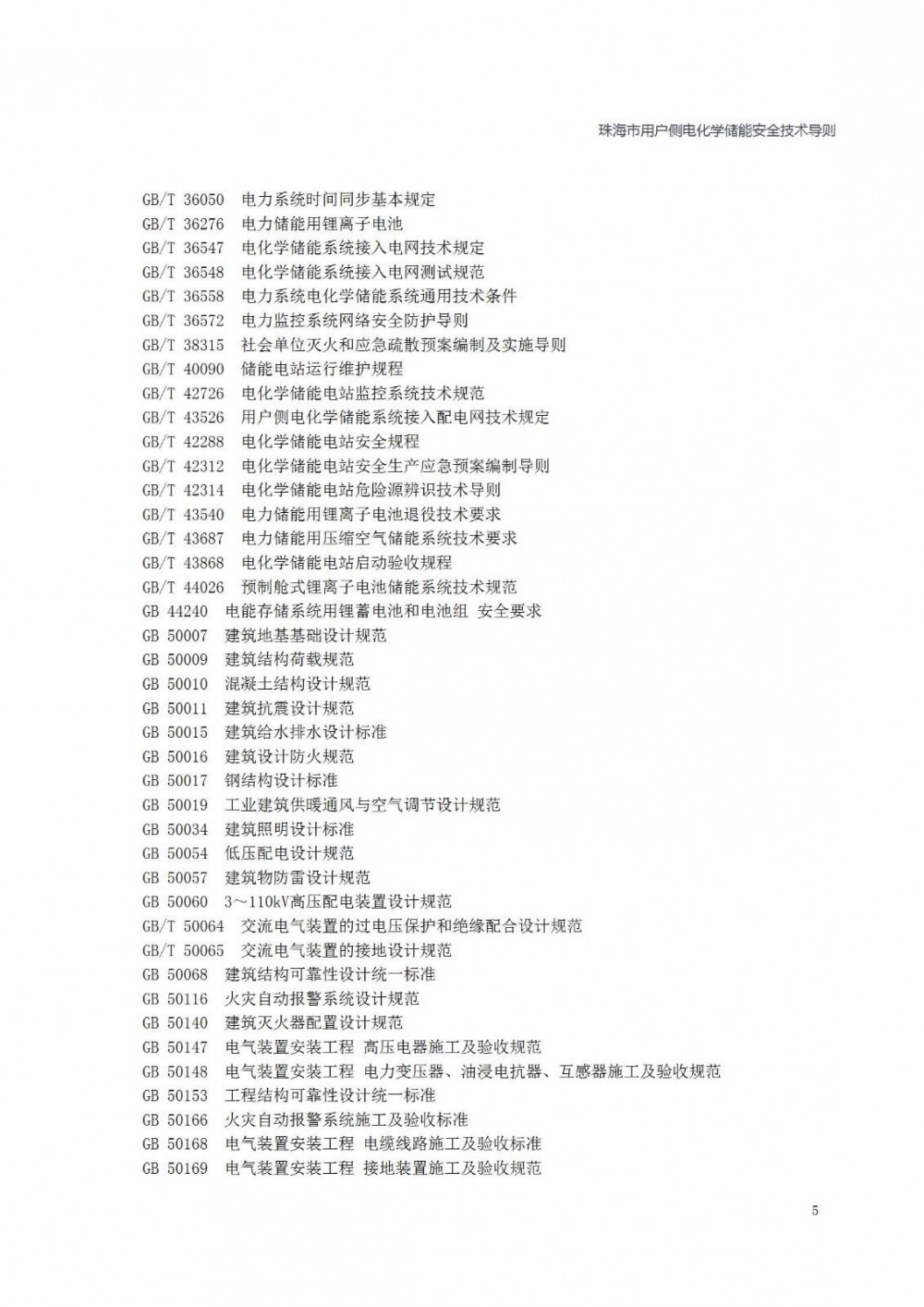 本导则执行标准严格遵循国家、省相关法律法规、政策文件及技术标准要求,结合珠海市用户侧电化学储能实际情况制定。各项条款内容均与现行有效的国家标准、行业标准相衔接,部分要求在国家标准基础上,根据珠海本地特点进一步细化、补充,确保标准的科学性、实用性与可操作性。