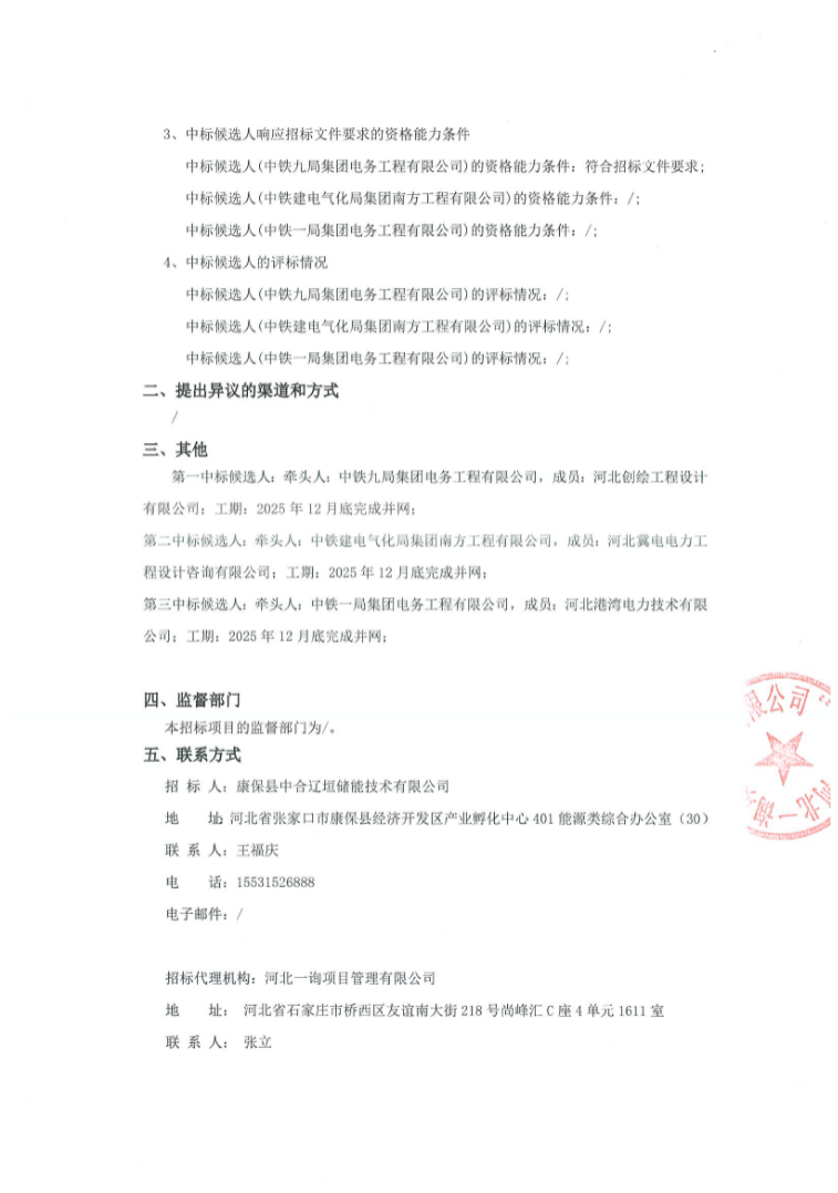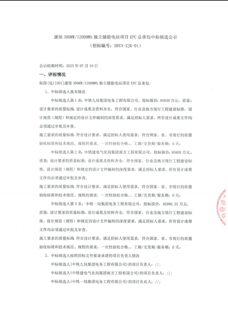 第一中标候选人为中铁九局集团电务工程有限公司河北创绘工程设计有限公司联合体,投标报价为95030万元,折合单价0.792元/Wh;